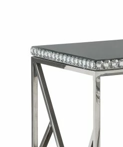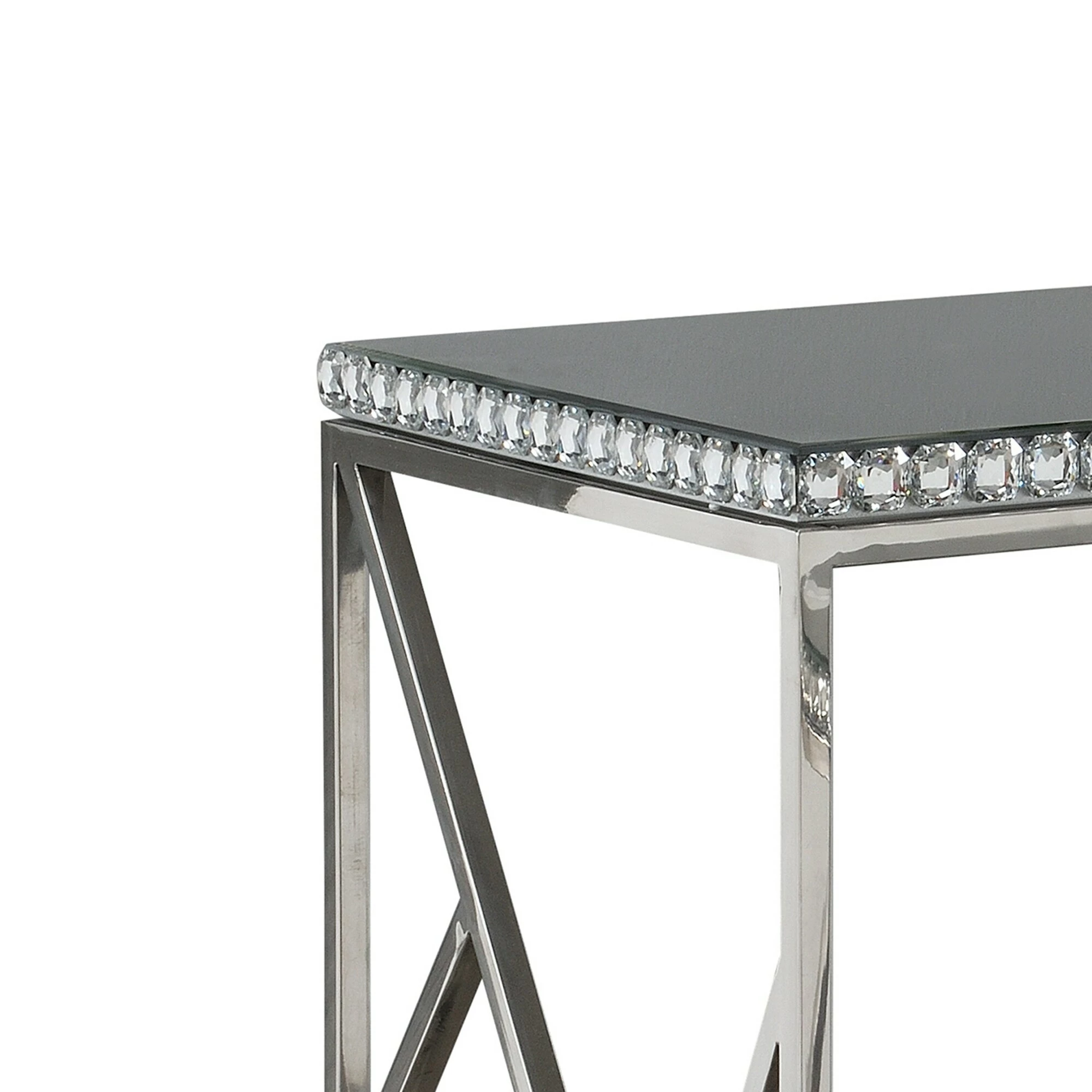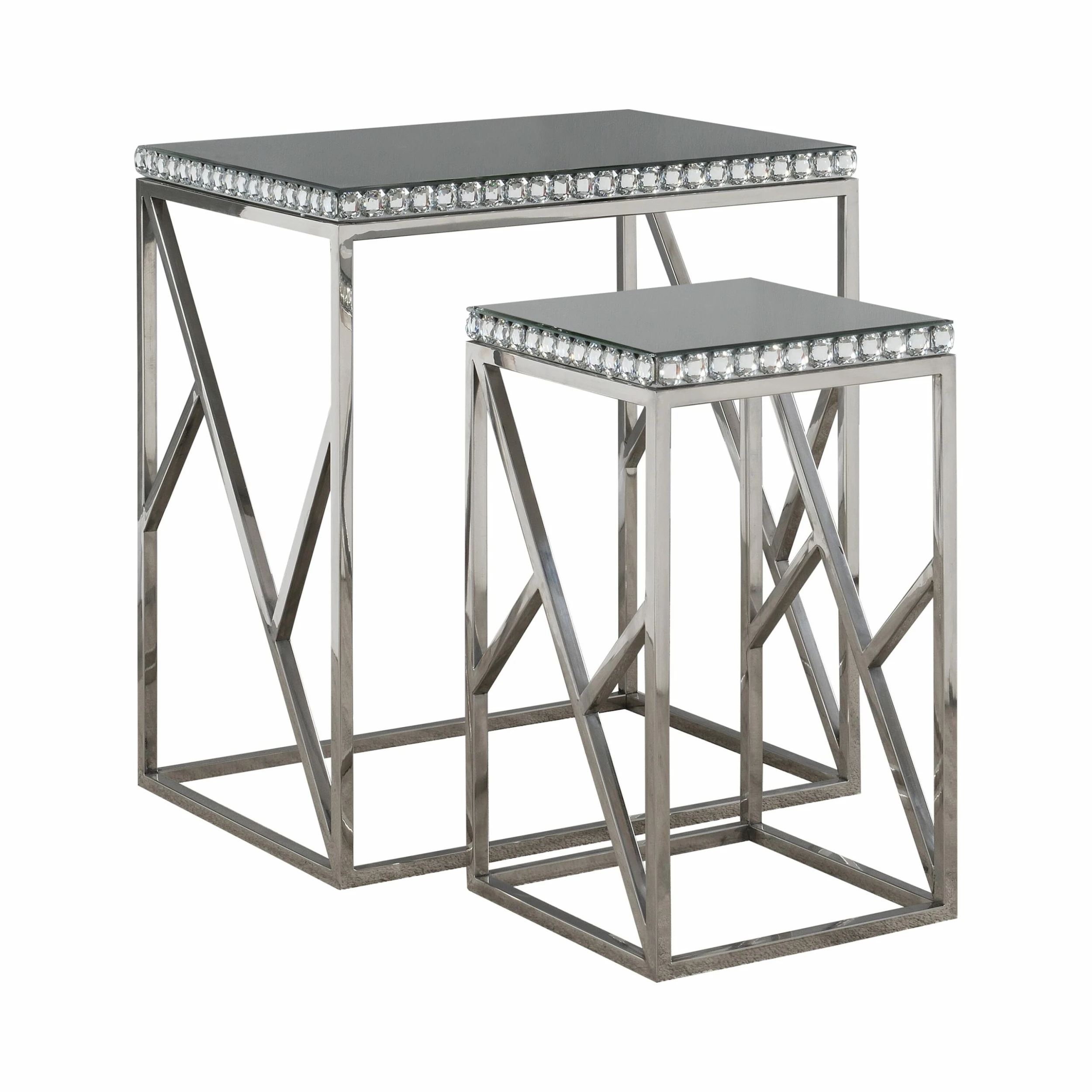 Show off your love for sparkle and shimmer this spectacular set of two silver nesting table. Your eyes will instantly be drawn to the clear crystal trim. Mirrored tabletops beautifully display your favorite decor. This nesting table set is supported on a stunning geometric shaped base made from metal. This gorgeous set will instantly add stylish flair to your space.