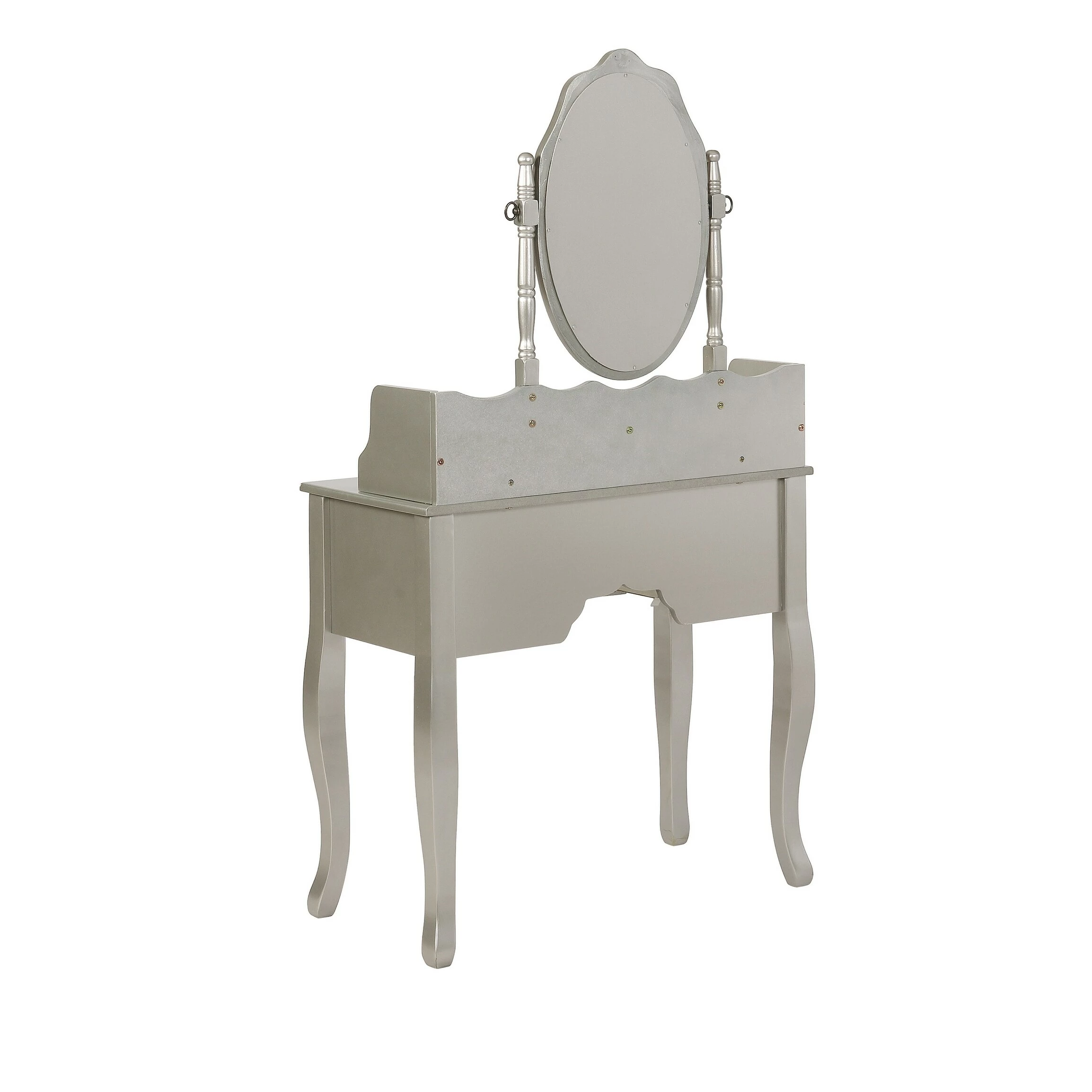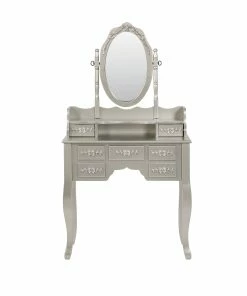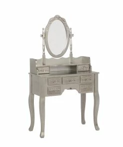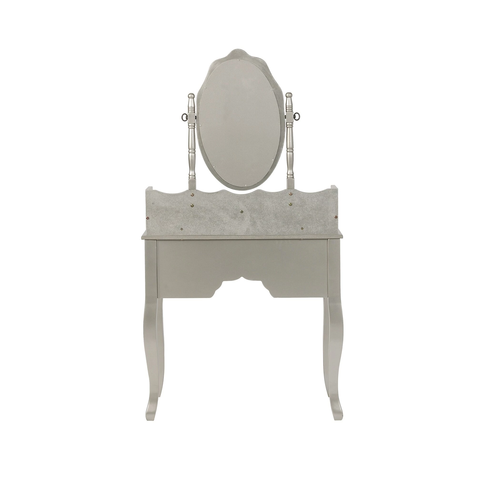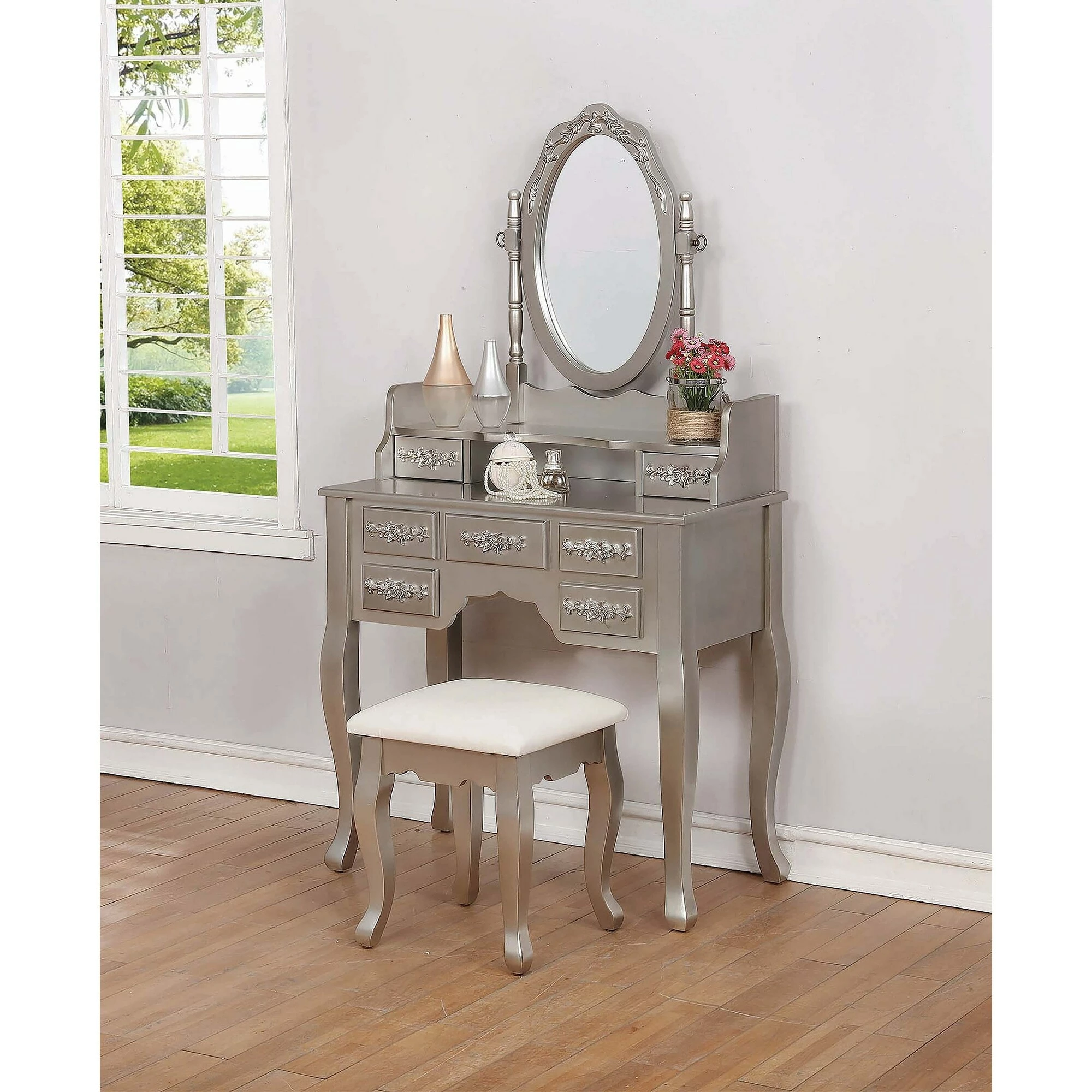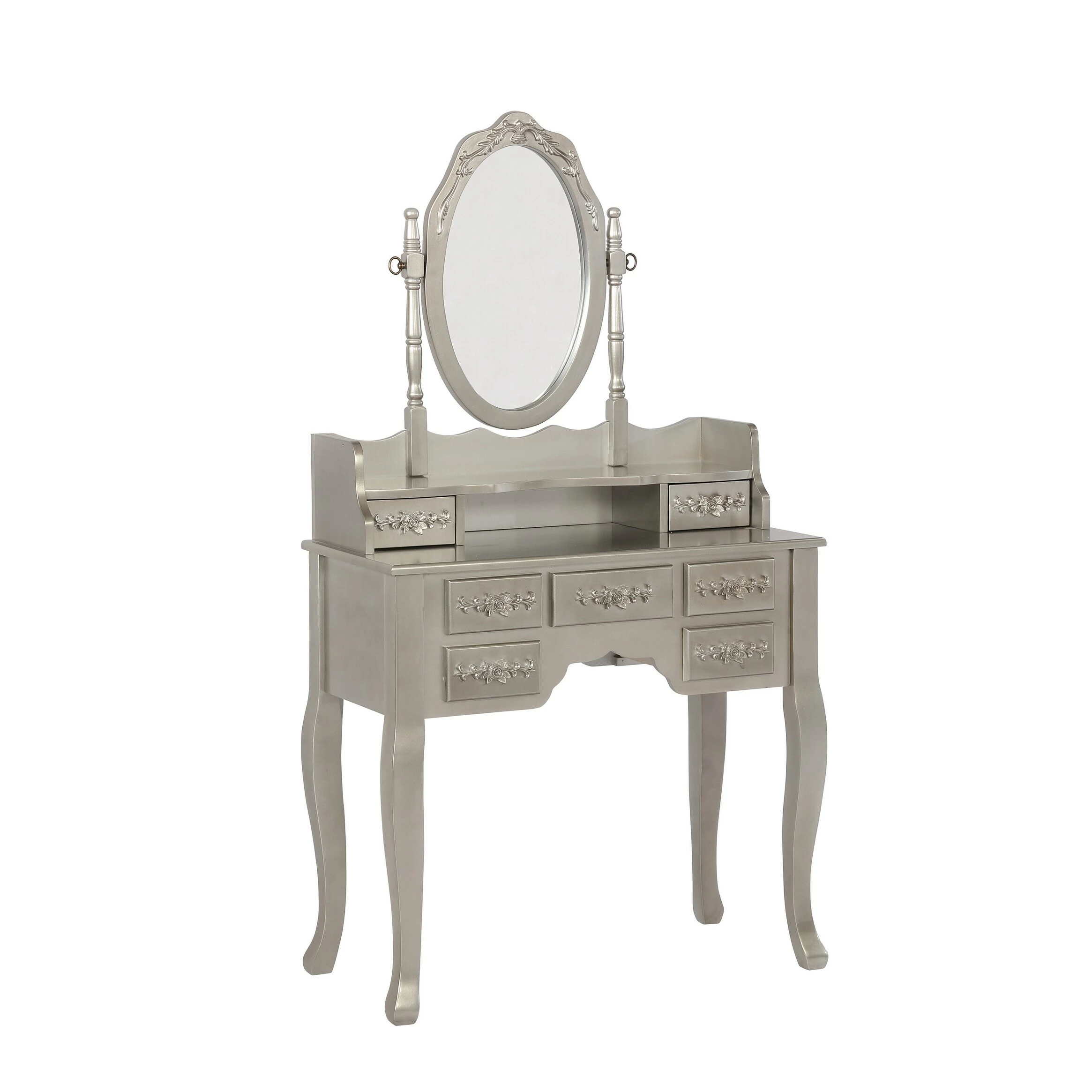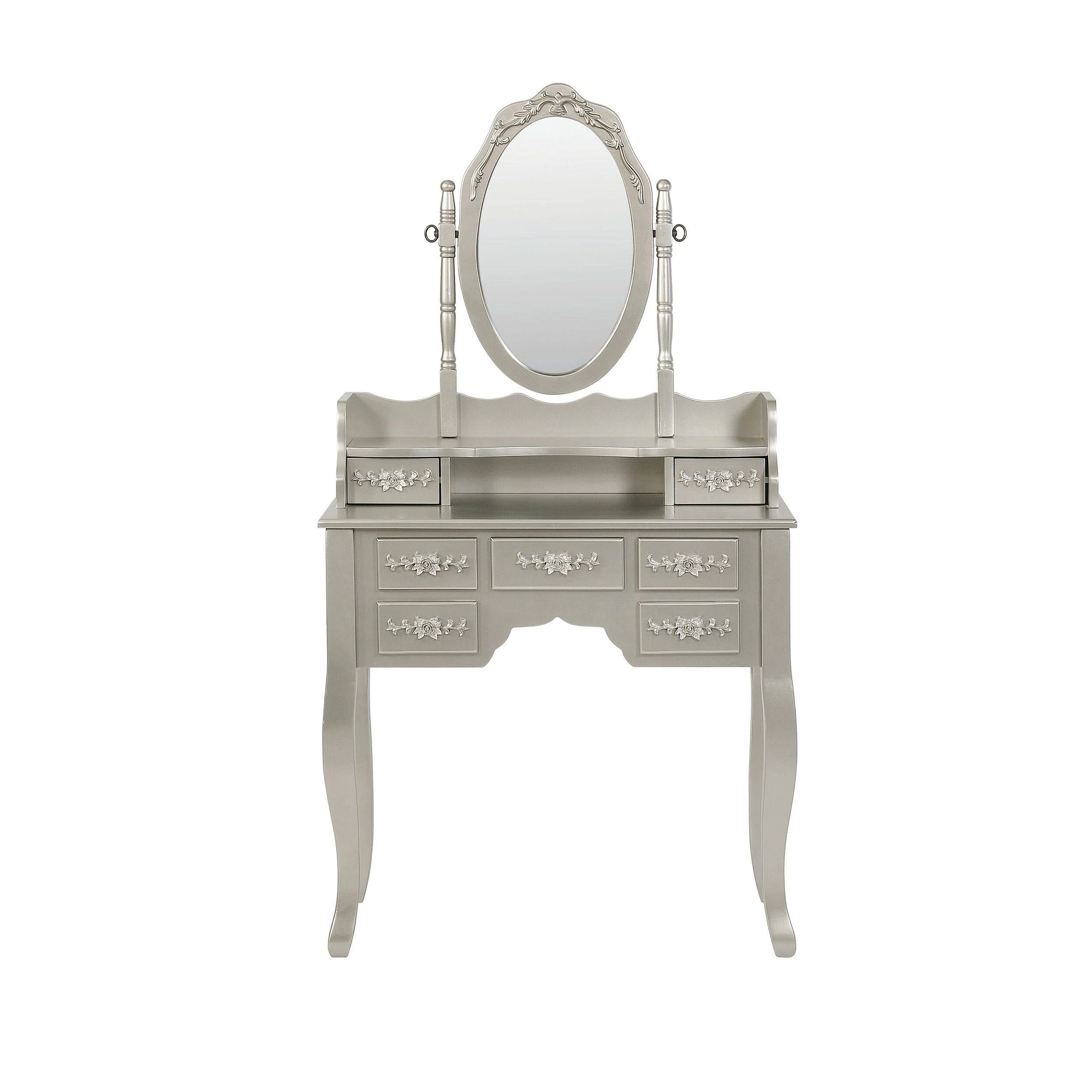 Visually striking, this three piece vanity set elevates a bedroom with glamour. The shiny silver finish emphasizes the curves in the legs of the desk and stool. The seven drawers on the desk feature an intricate floral wood carving, full of chic detail. A curve in the middle of the hutch offers storage options on both the desk and below the mirror. With an oval silhouette, the delicate mirror is also decorated with an ornate floral design and is supported by two carved posts.