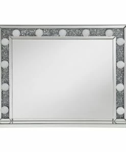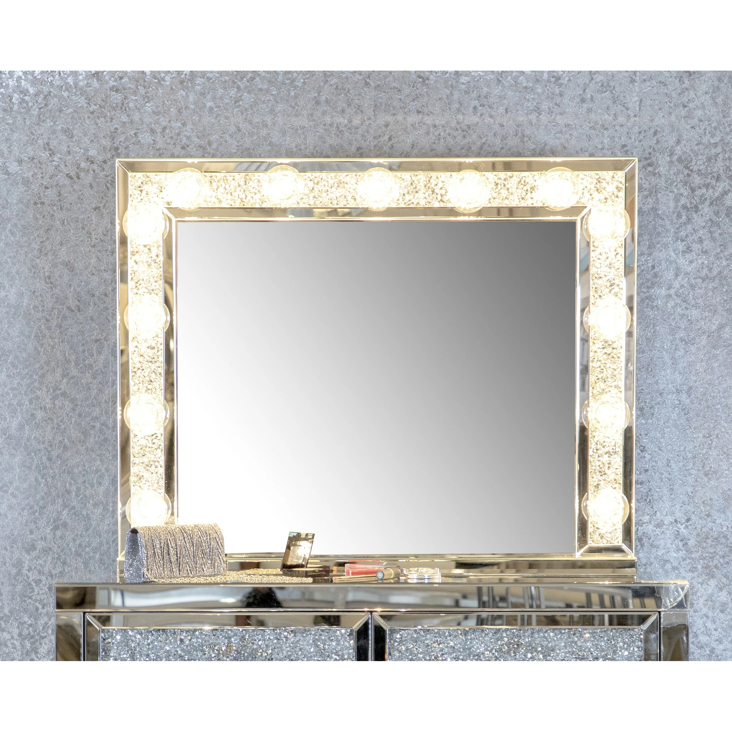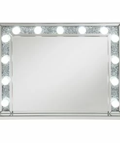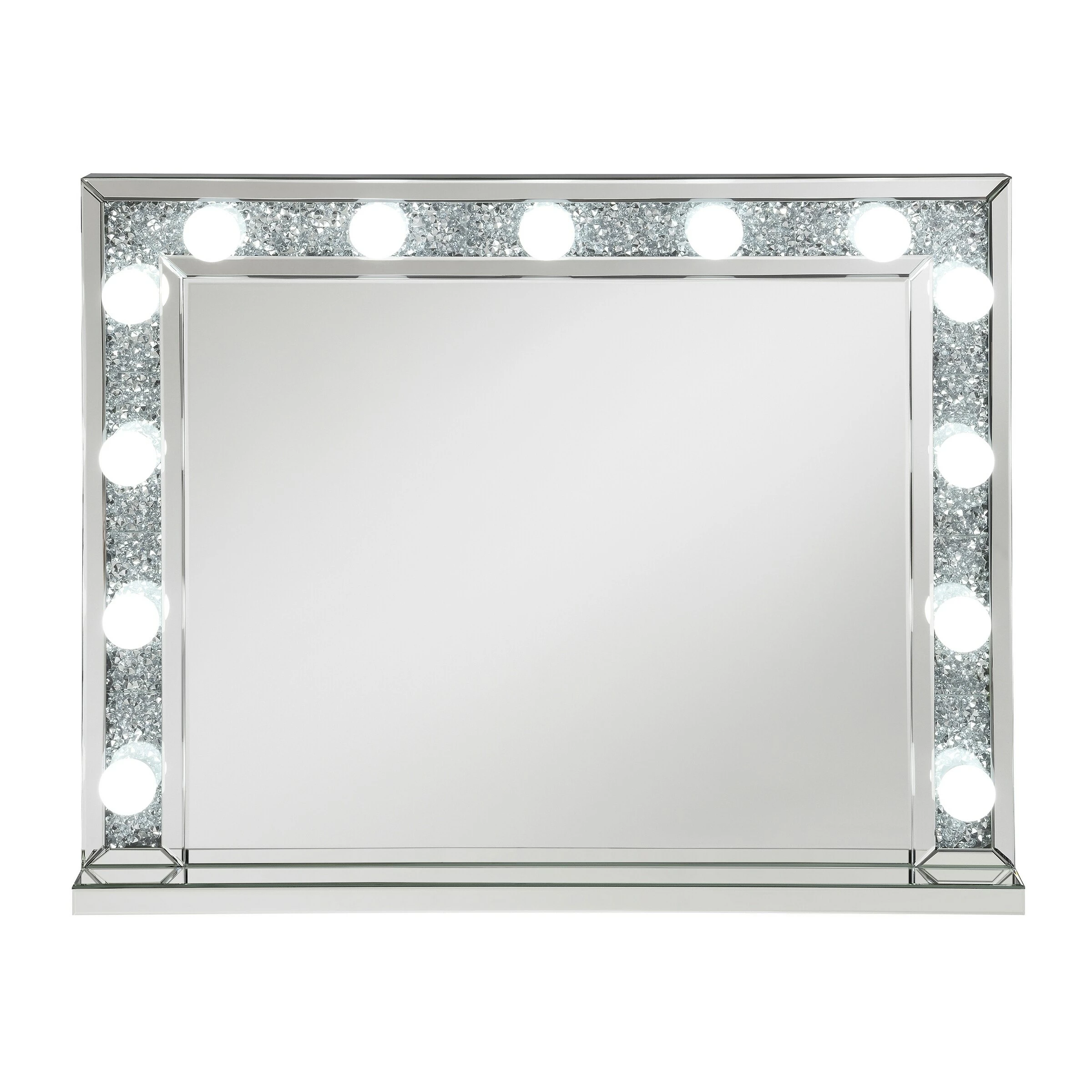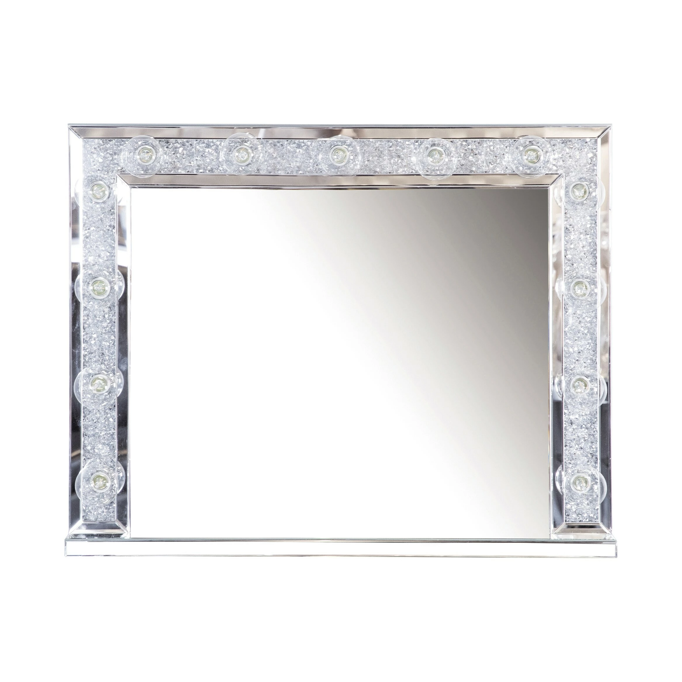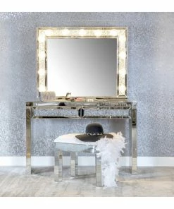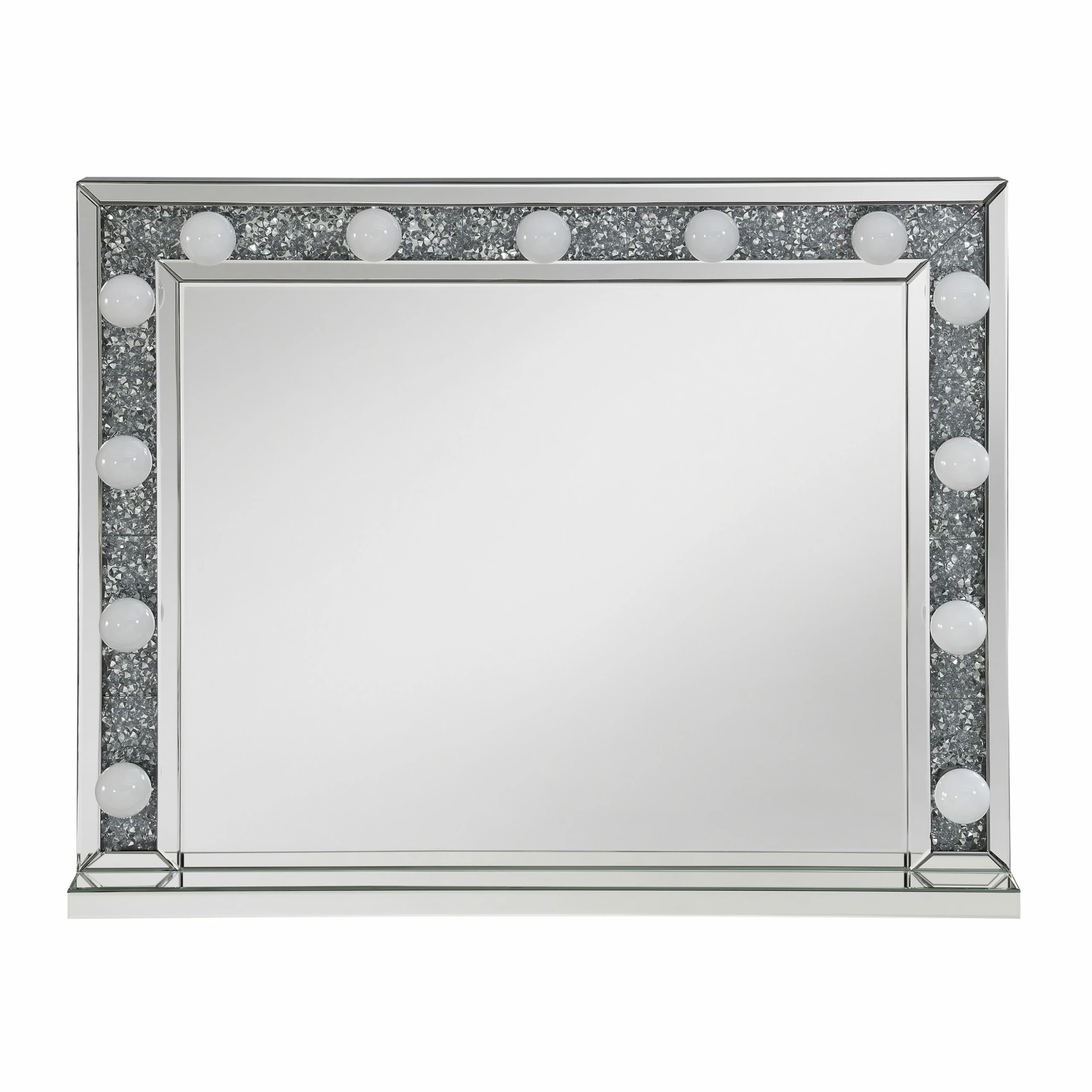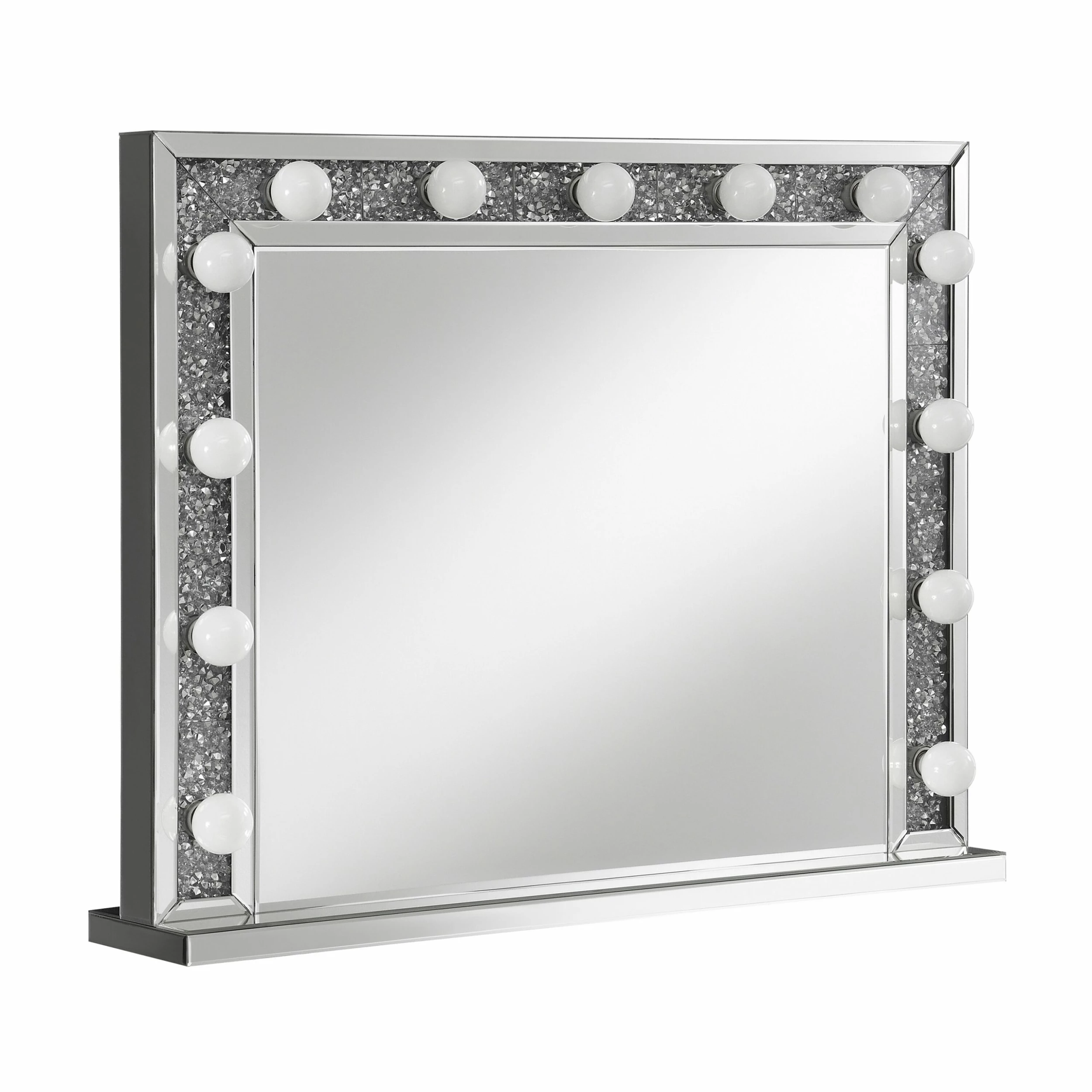 With a Hollywood regency flair, this table mirror is perfectly suited for a vanity tabletop. Place it above a vanity for a place to sit an apply makeup and more. With a rectangular shaped frame, filled with glimmering silver crystals and outlined in mirror paneling, this mirror offers all the luxe glam you need. As practical as it is glamorous, it offers a button switch power cord and over a dozen opaque white globe style bulbs for a retro-inspired look. Place this vanity mirror in a dressing area for a regal flair.
