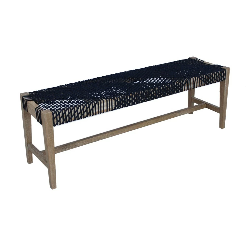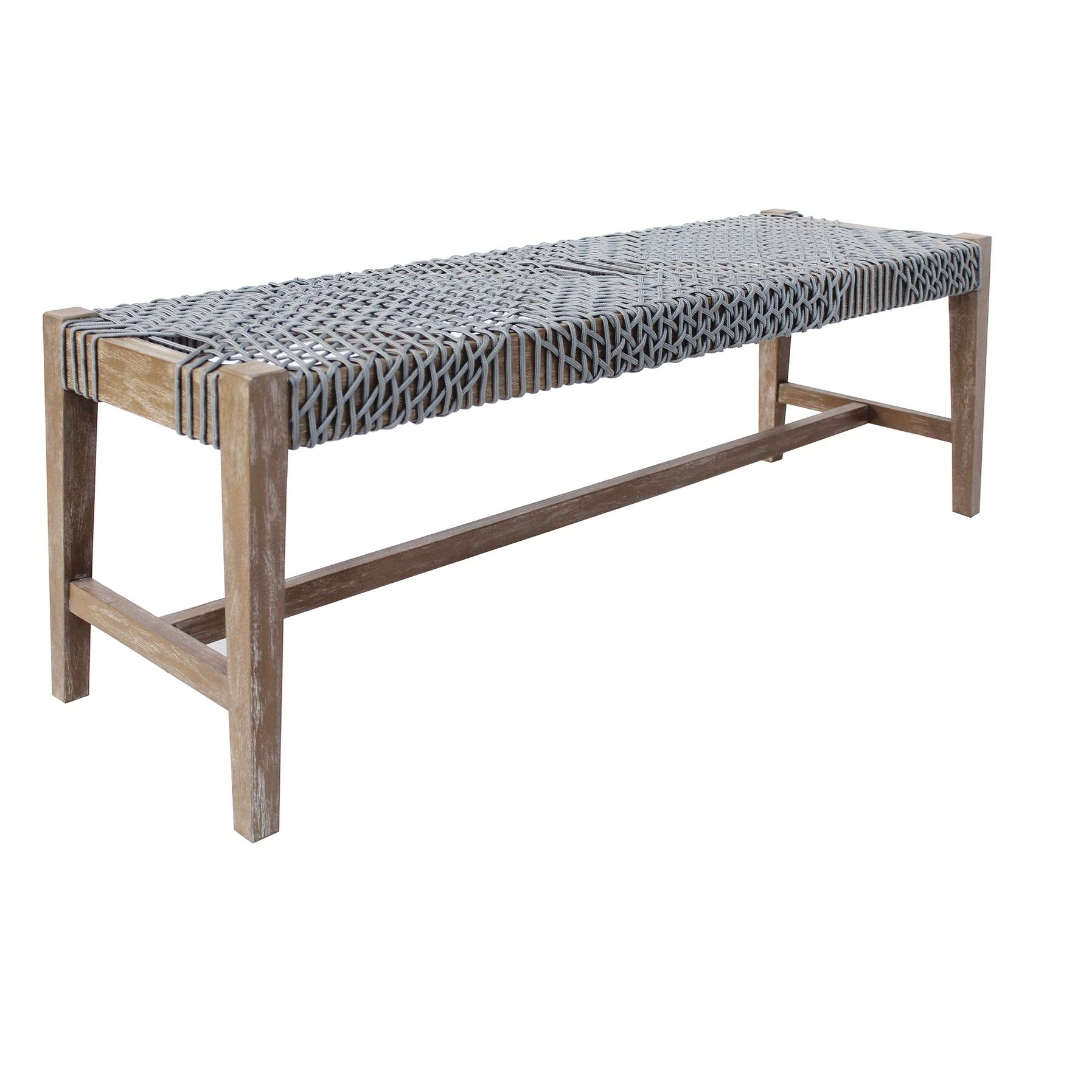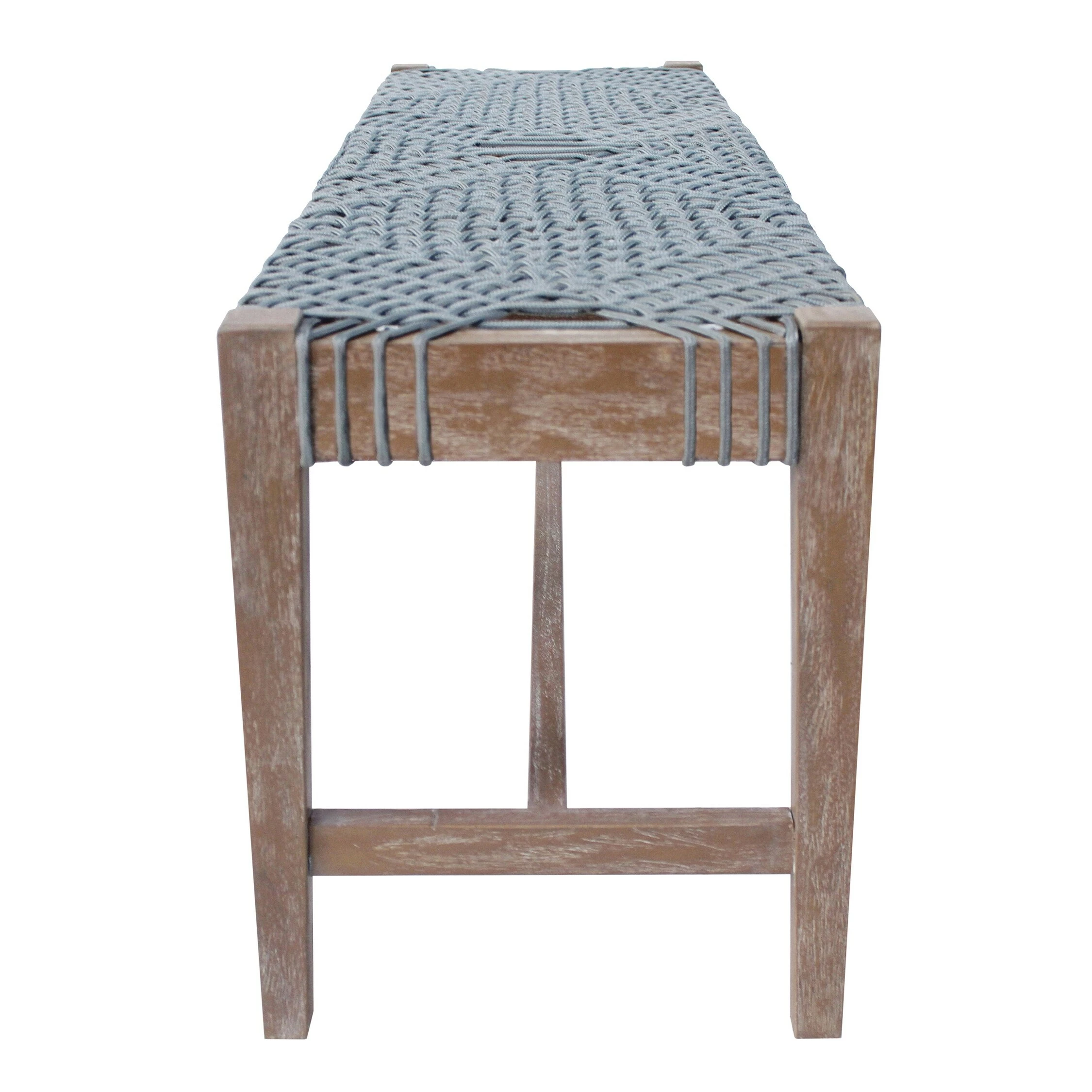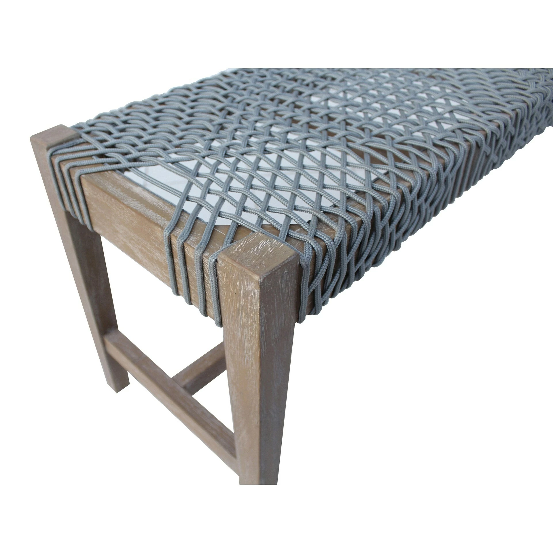 Constructed of a durable solid mahogany wood with a weathered finish, this transitional style bench offers a versatile seating space. With a coastal beach cottage style vibe, this bench offers nautical-inspired features, including an intricately woven rope seat reminiscent of fisherman nets. Place it aside a dining table or within an entryway foyer as a place to sit and remove your shoes after a long day. With slim tapered legs and a supportive brace, this bench is sure to last many years in your home. Find the right color for your existing decor palette with choices of a neutral grey or dark navy poly rope.