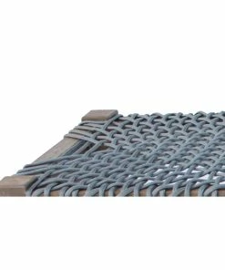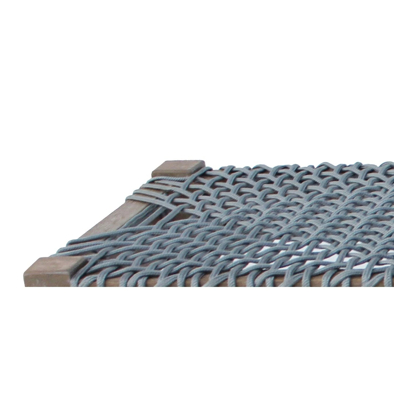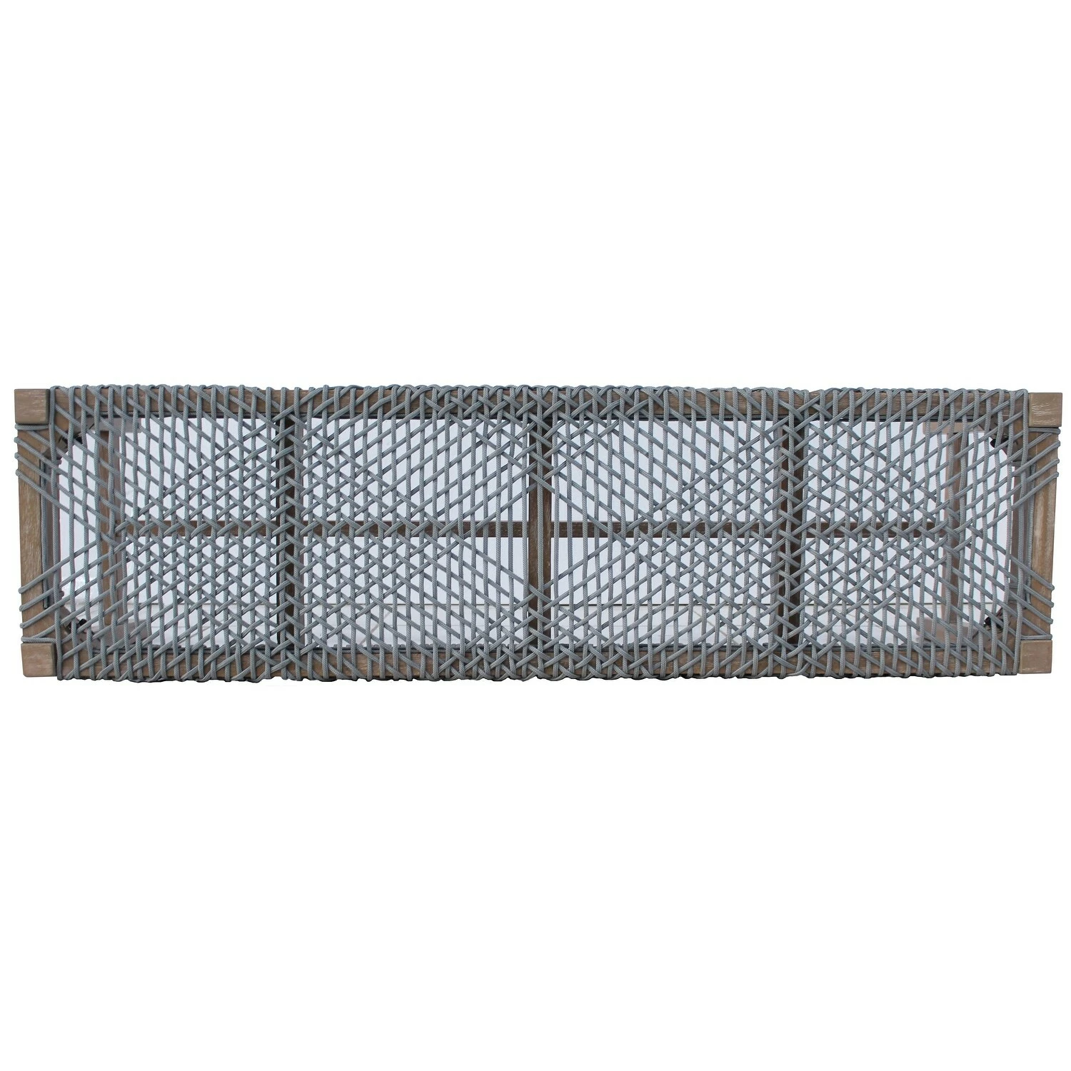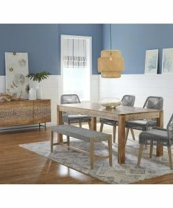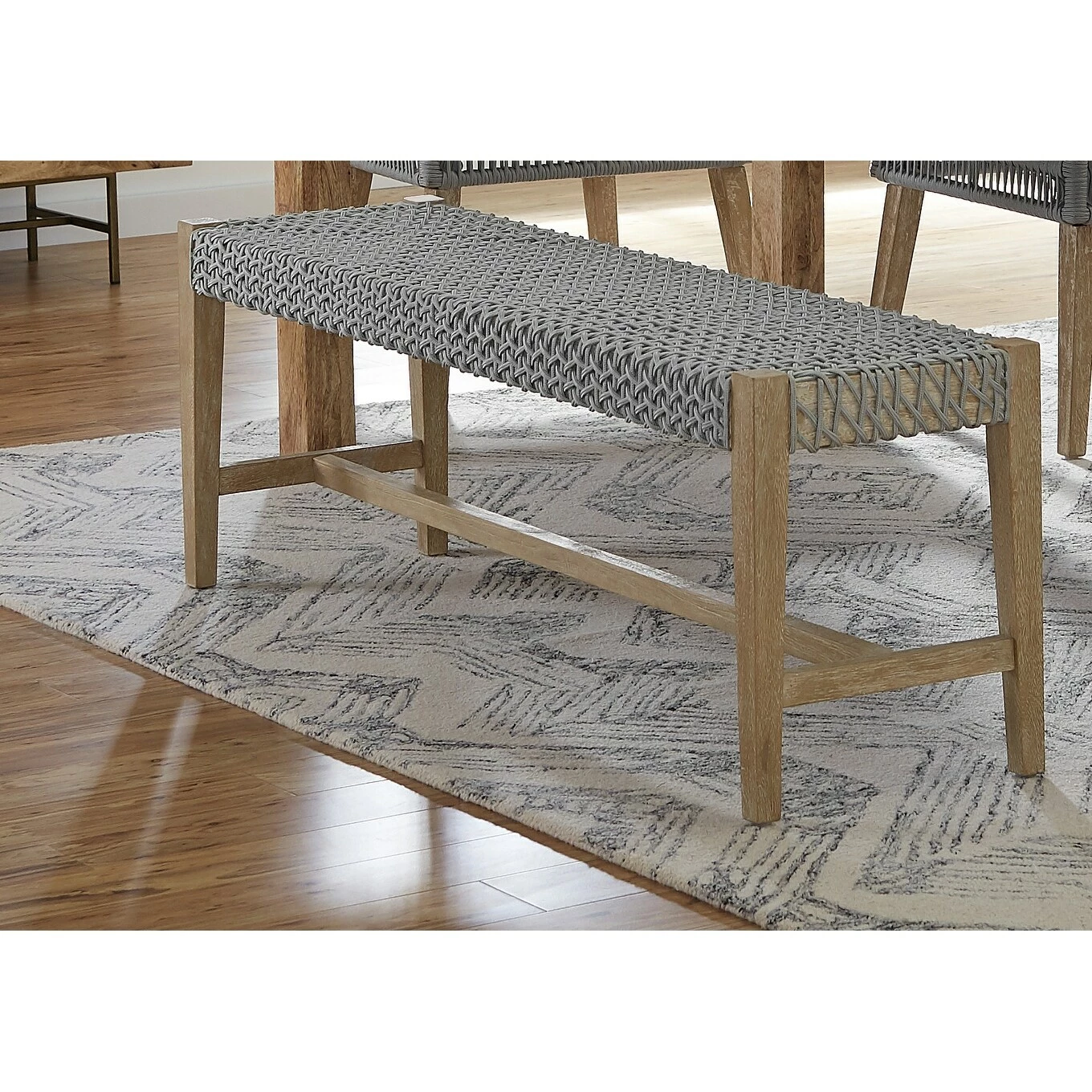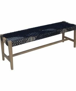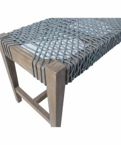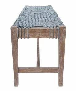 Constructed of a durable solid mahogany wood with a weathered finish, this transitional style bench offers a versatile seating space. With a coastal beach cottage style vibe, this bench offers nautical-inspired features, including an intricately woven rope seat reminiscent of fisherman nets. Place it aside a dining table or within an entryway foyer as a place to sit and remove your shoes after a long day. With slim tapered legs and a supportive brace, this bench is sure to last many years in your home. Find the right color for your existing decor palette with choices of a neutral grey or dark navy poly rope.