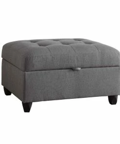 Take advantage of a dual-purpose design that adds storage as well as seating comfort. This grey upholstered storage ottoman makes room for hiding essentials while it acts as a comfy spot for sitting atop a padded, tufted surface.