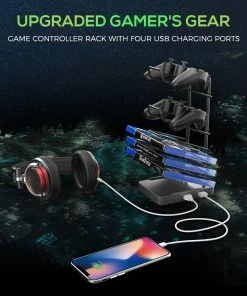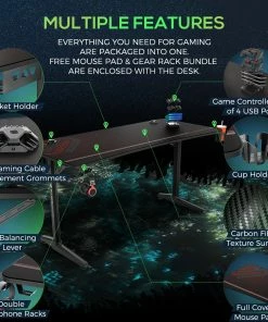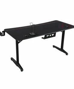 Immerse yourself in the battle with this contemporary gaming desk. Designed with a carbon fiber textured desktop, complete with a custom tailored full coverage removable mouse pad, this gaming desk has all the bells and whistles a gamer will appreciate. This minimal desk also features a convenient built-in dual headset hook and cup holder to keep gear organized and within reach. Plus, you can rest assured your area doesn’t clutter with cables, using the two cable management grommets and handy socket holster. A gamer rack keeps your controllers and games all neat and organized too, while four USB outlets ensure all your devices are good and charged.