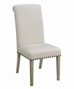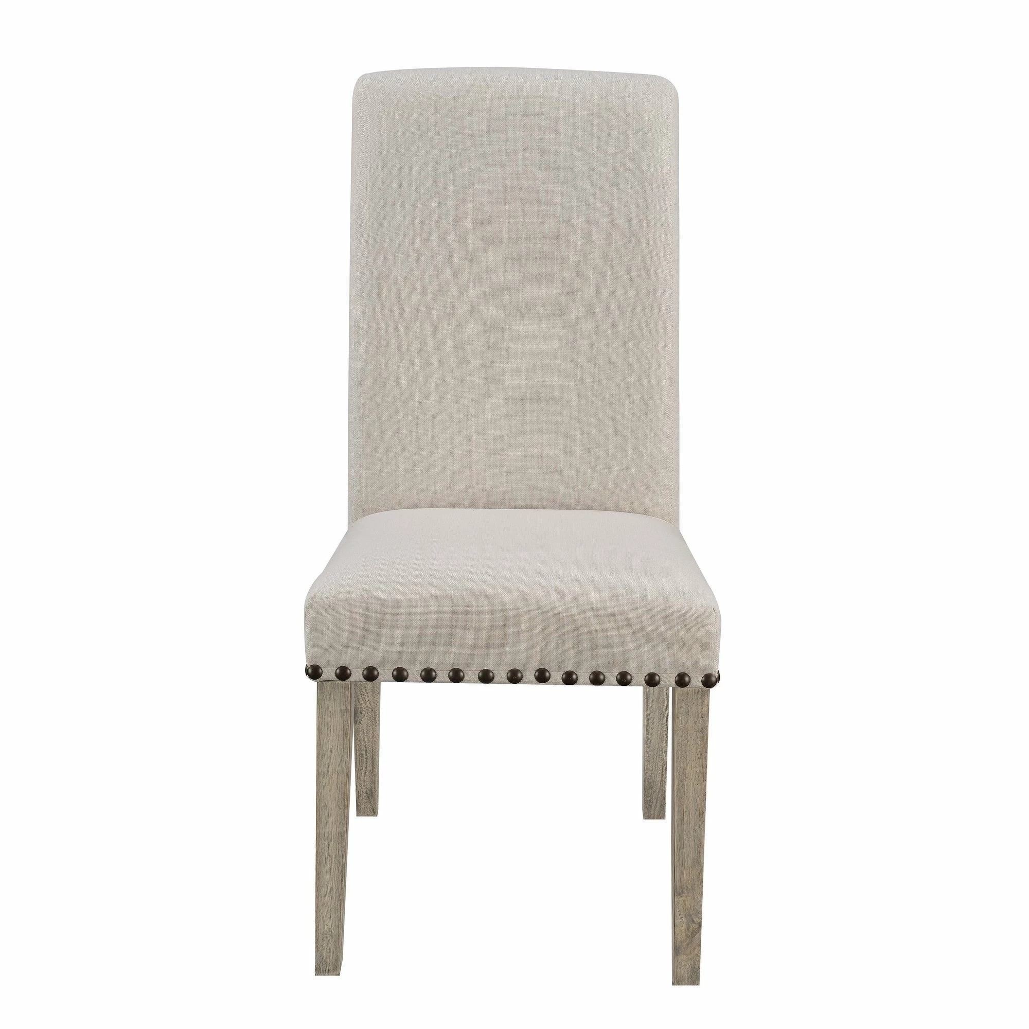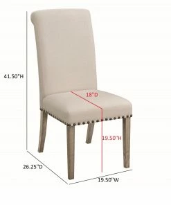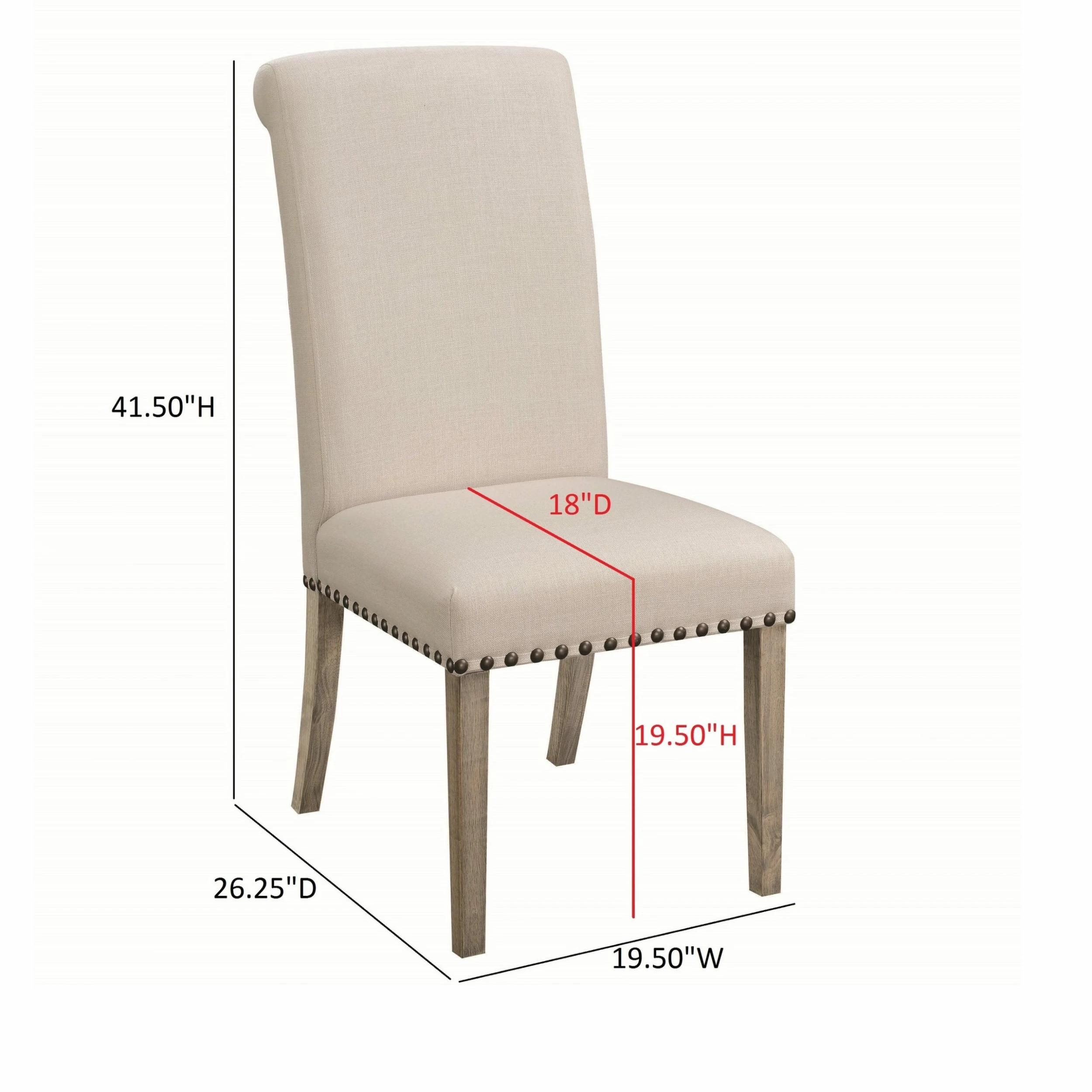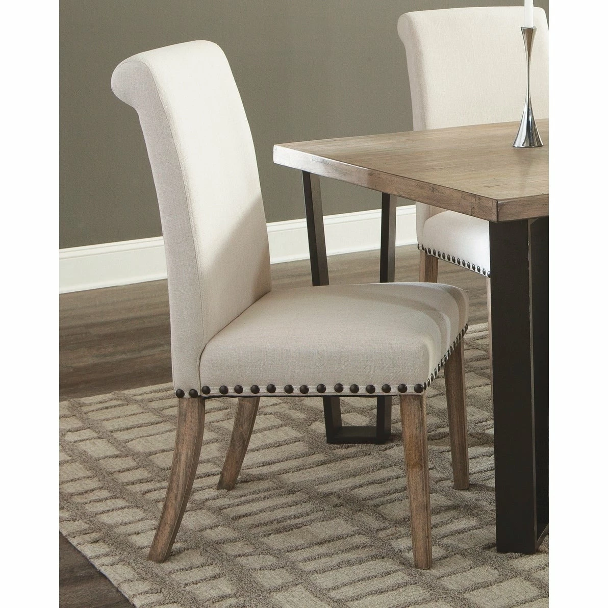 Dress up a classic dining room with the simple twist on this upholstered parson dining chair in a beige linen-like fabric. Dark bronze nail head trim contrasts against the lightness of the upholstered cushions and rustic pine legs for a classy look.