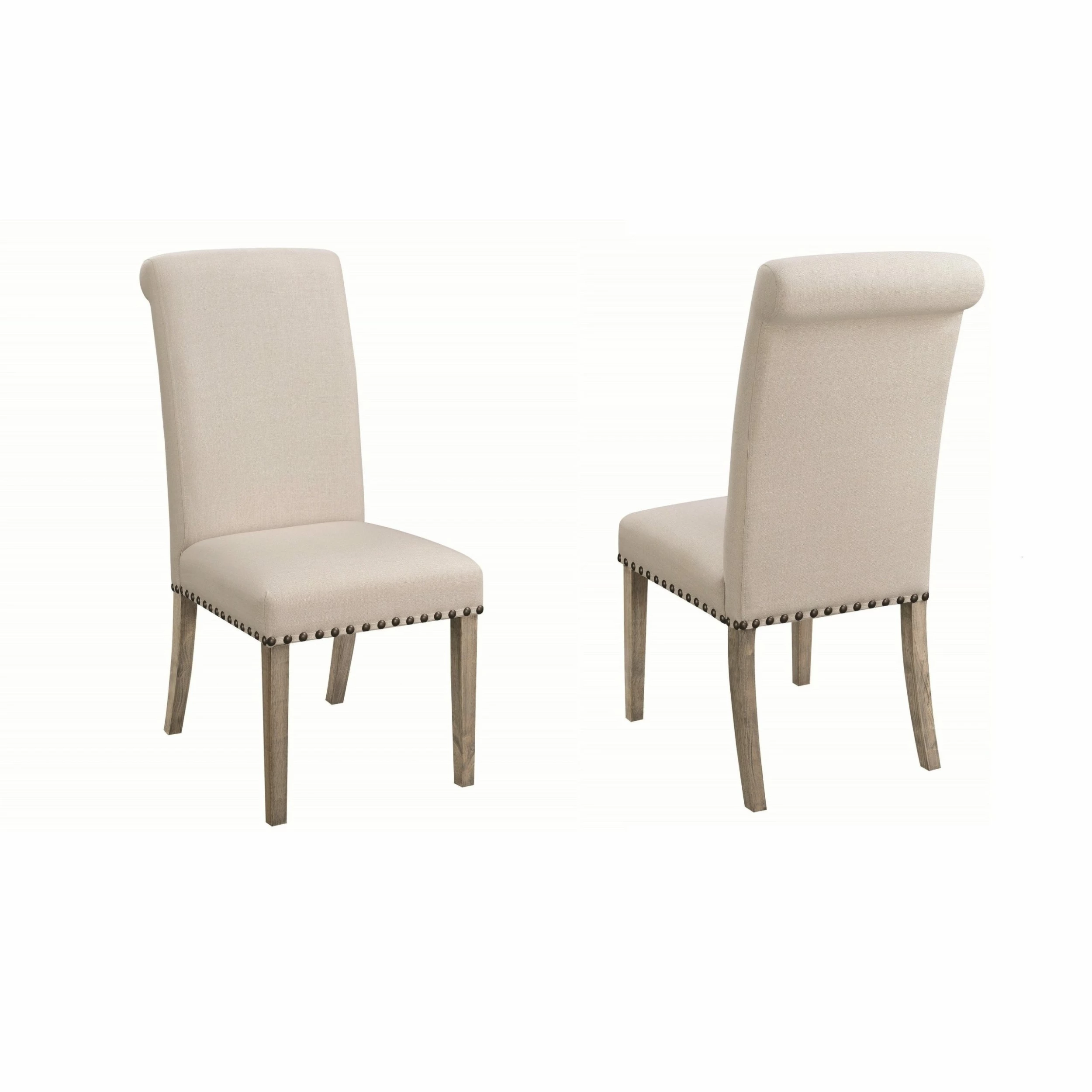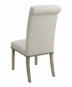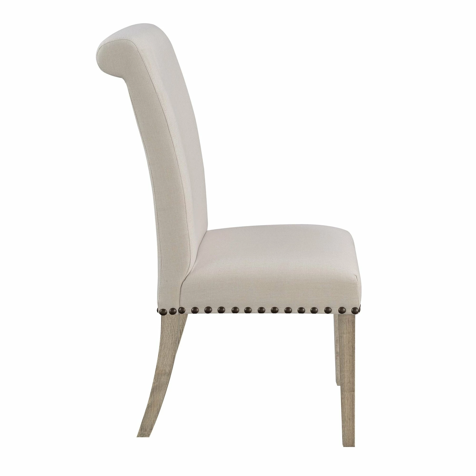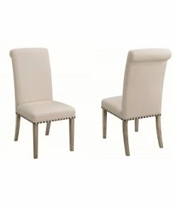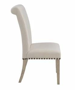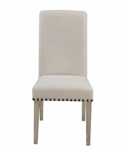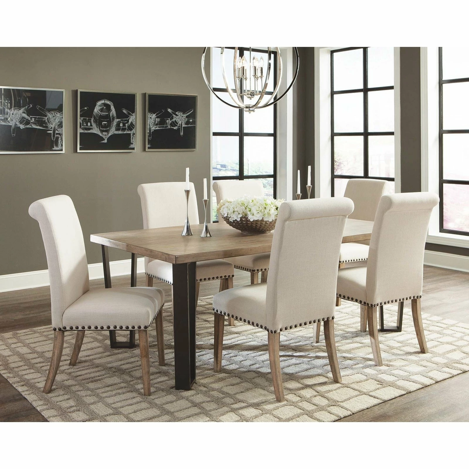 Dress up a classic dining room with the simple twist on this upholstered parson dining chair in a beige linen-like fabric. Dark bronze nail head trim contrasts against the lightness of the upholstered cushions and rustic pine legs for a classy look.