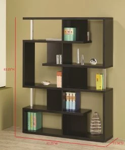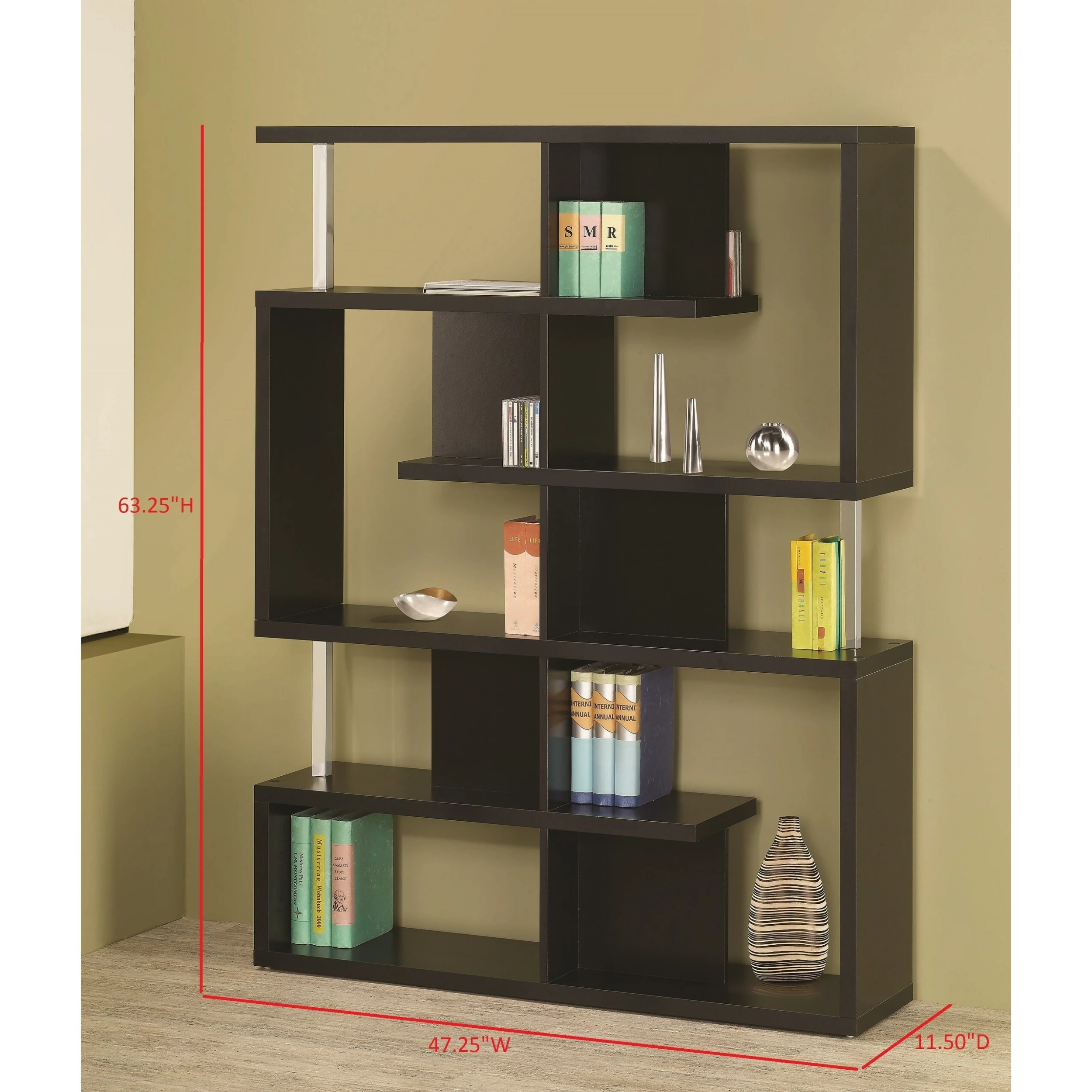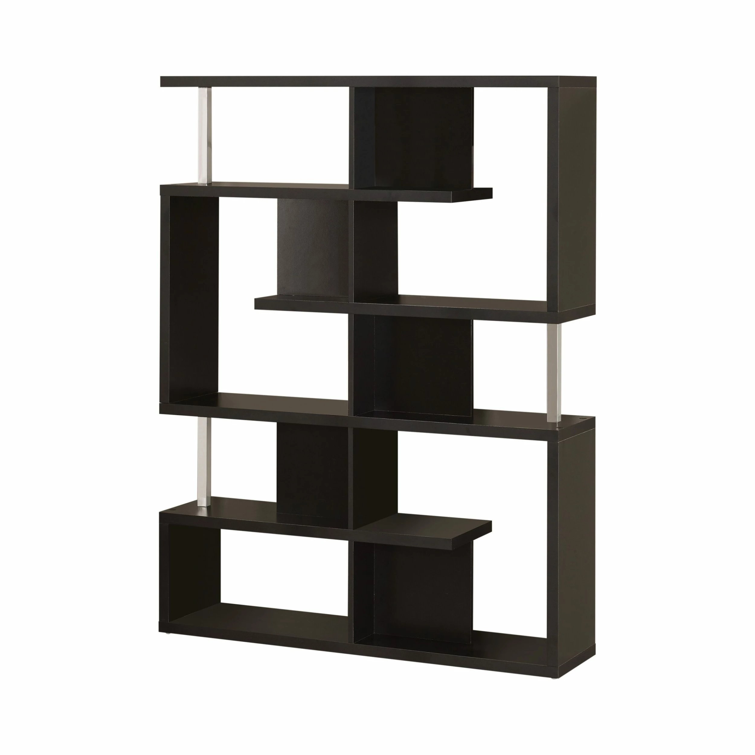 Make the most of an intriguing design and add this transitional black bookcase to a home office or living space. Chrome accents add to the distinguished look of this bookcase, which creates ample storage space on ten modular-design shelves.