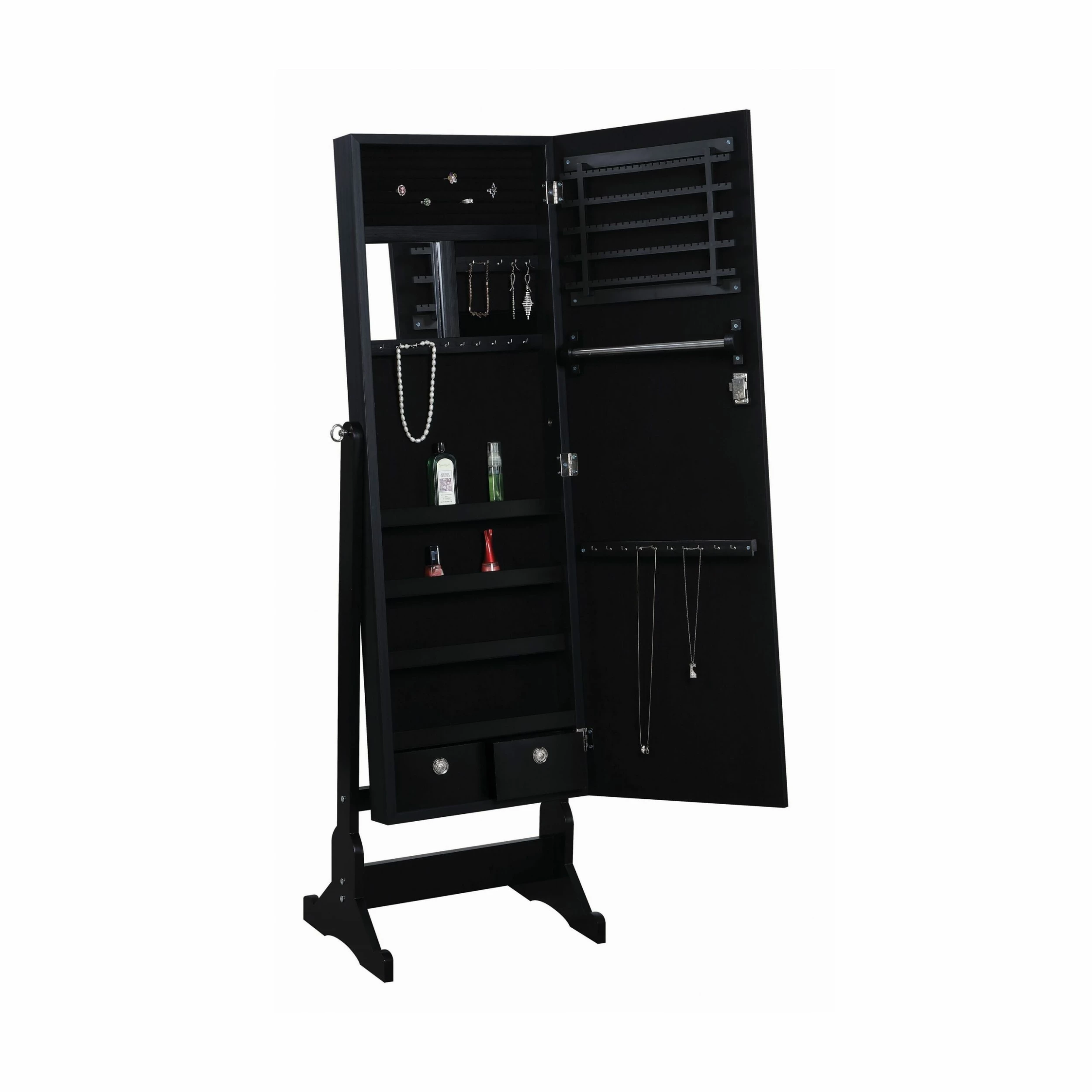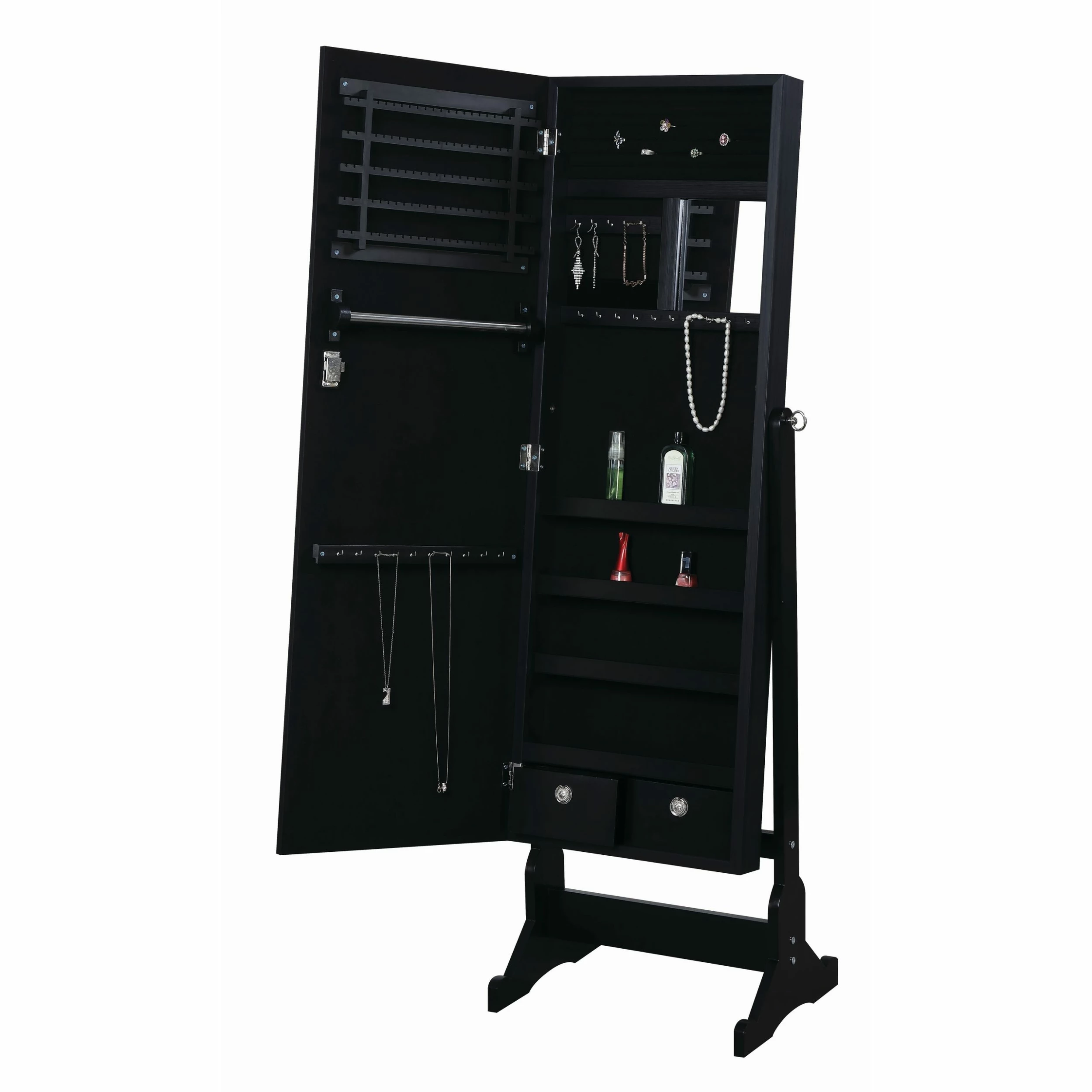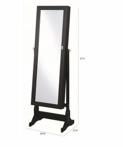 Stylize a transitional space with the crisp, clean silhouette of this black finish jewelry cheval mirror. Poised to adjust on an easel frame, its gorgeous finish receives tasteful metal accents, while a hidden interior space creates options for storing jewelry and valuables.