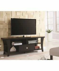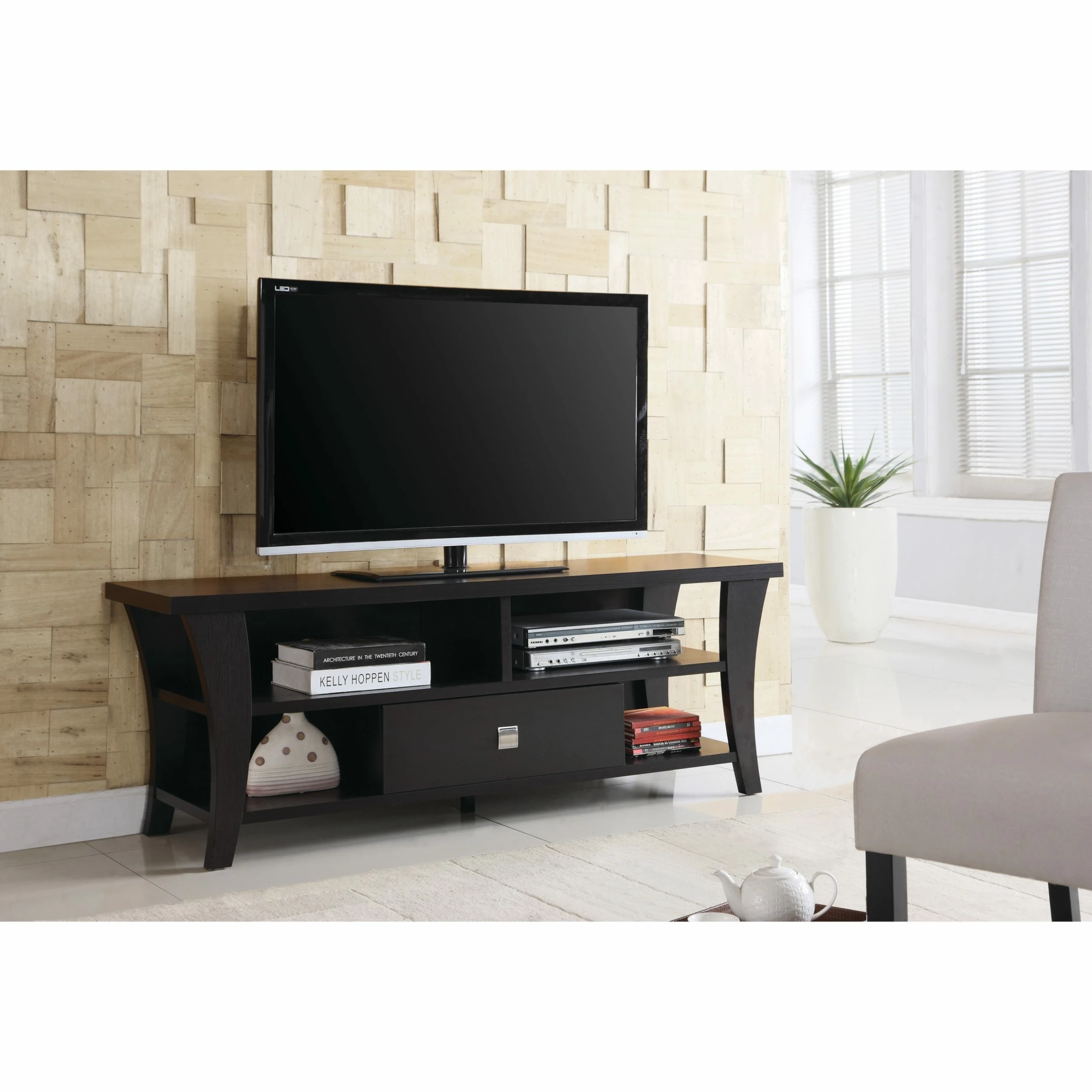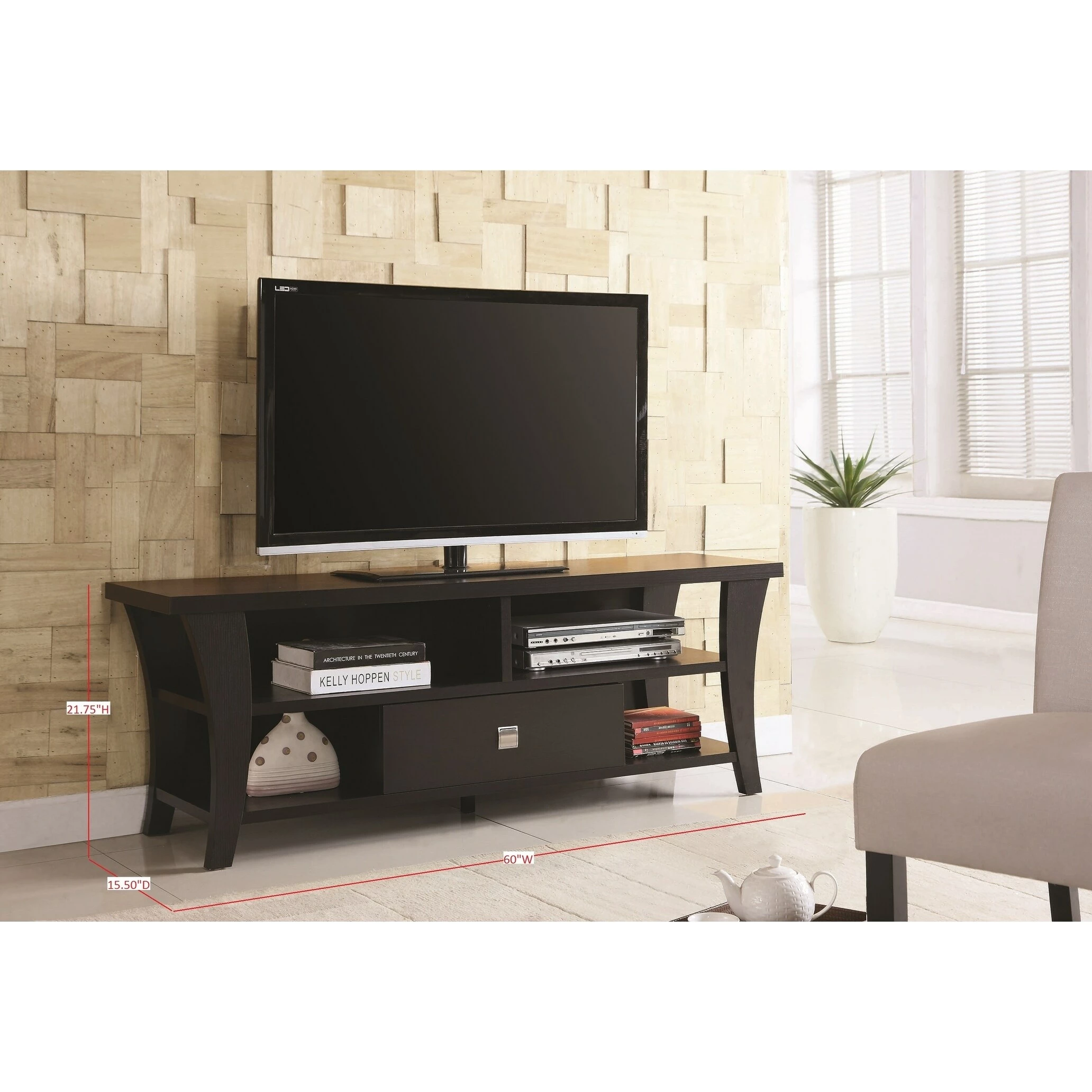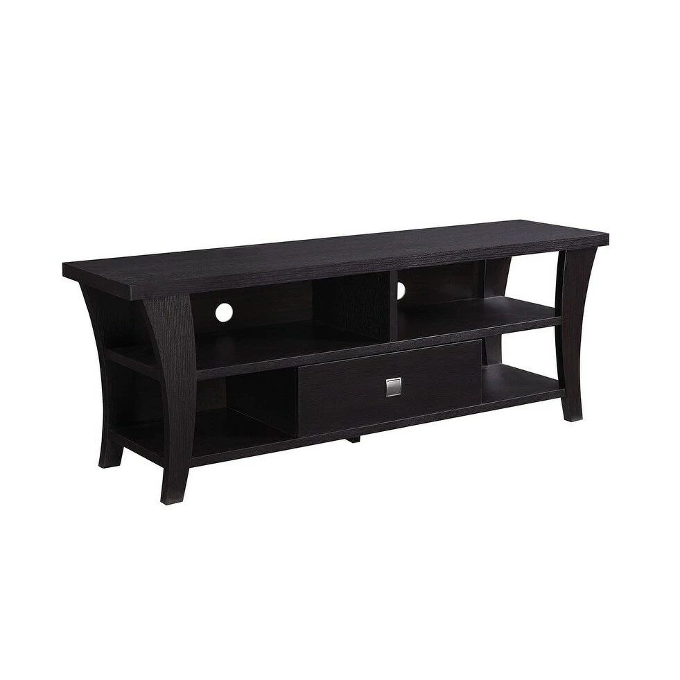 Artistic, gentle curves add character to the elegant silhouette of this transitional TV console. A rich cappuccino finish stands out as bold and stylish, while wide upper and lower shelving creates ample space for stashing media and decor essentials.