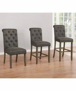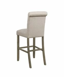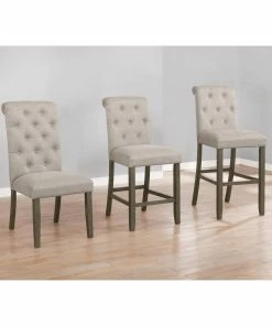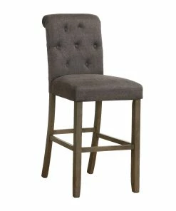 This set of two traditional stools offer a striking color combination. Its upholstered seat is wrapped in a linen-like fabric, offered in two color combinations. On the seat are classic button tufted details and a tall backrest with a rolled top. The upholstered seat is supported by a wooden frame, complete with a rustic brown finish that lends a country charm. The straight, squared legs offer extra support, as well as a foot brace for added stability.