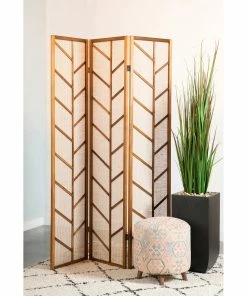 Soften a corner or break up a spacious room with this three-panel folding screen. With a mixed material design, each of the three screens are framed in a solid pine wood in a warm walnut finish, complete with a feather-like motif. Ideal for adding a rustic flair to a contemporary space, this folding screen is perfect for a farmhouse modern style home. Held within the frame is a semi-translucent screen made of a natural jute linen fabric. Metal hinges offer support and smooth foldability.