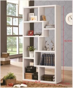 A whimsical geometric design blends open spaces that display decor and books in style on this white modular seven-shelf bookcase. Perfect for a casual modern space, its open-back design offers a view of wallpaper or a stylish painted wall.