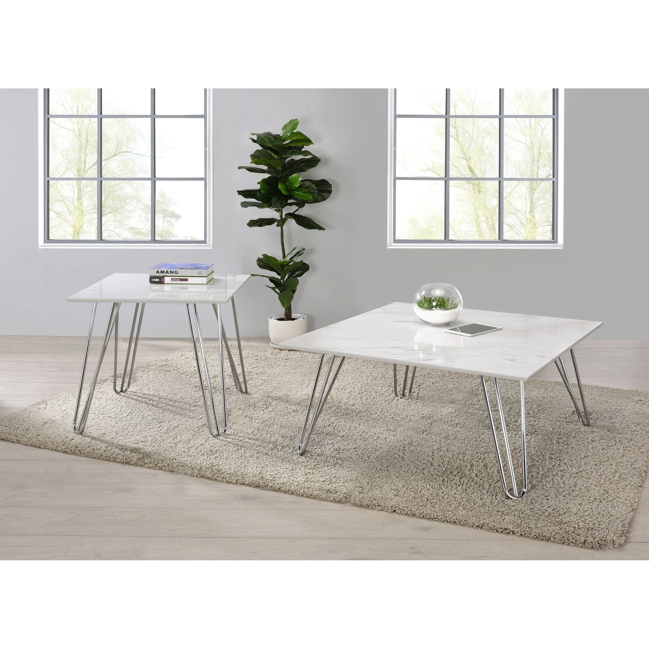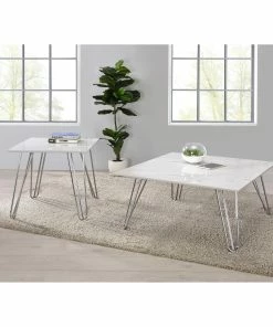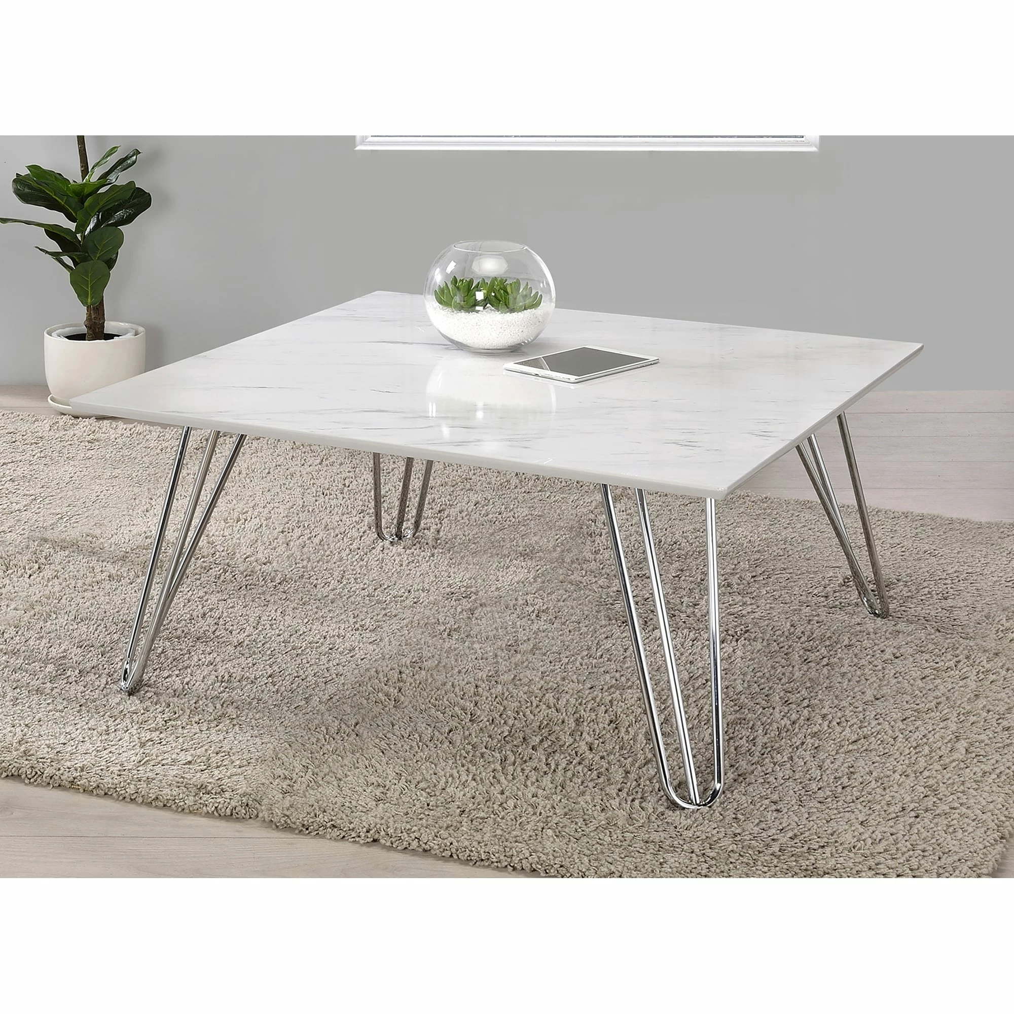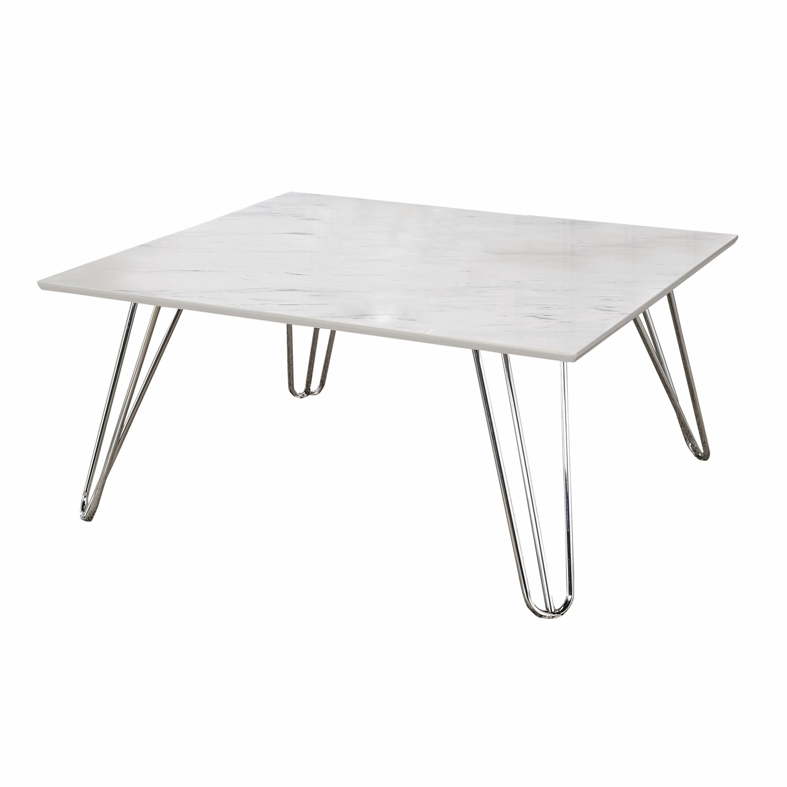 With a spacious white faux marble square top, this modern coffee table is the perfect furniture piece to place in front of a seating arrangement. Perfect for a more contemporary living space, it offers a touch of glam touch, and is large enough to support a tray or snacks and refreshments as well as any decor. Flared hairpin style legs offer a retro-inspired look and a mid-century vibe. The coffee table’s legs are further accentuated by gleaming electroplated chrome finish adds a certain charm. With these elements, this coffee table is sure to stand out.
