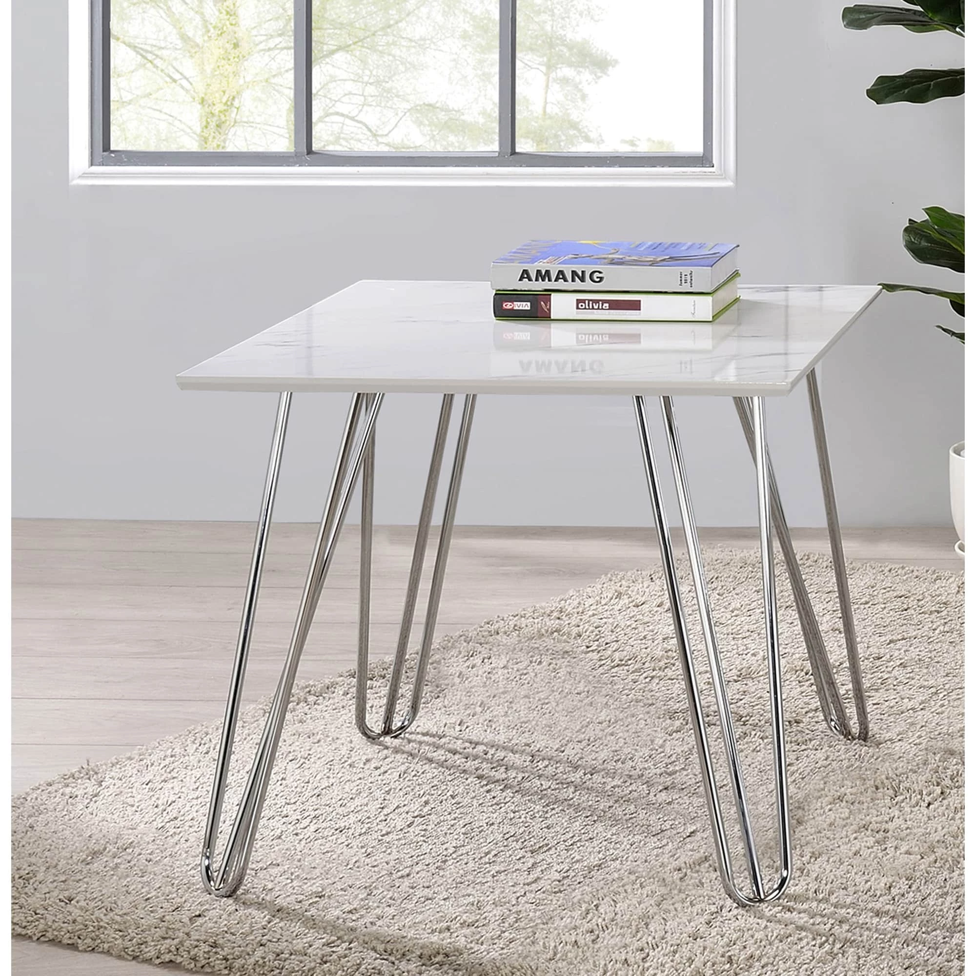 A white faux marble adds a classic, timeless look to any space. And with a spacious square top, this end table is the perfect furniture piece to rest next to an accent chair or sofa. Perfect for a more modern living room and offering a glam touch, this end table can support a cocktail or your latest good read. Flared hairpin style legs lend a mid-century modern touch, while their gleaming electroplated chrome finish adds a striking contemporary charm. With bright elements, this end table is sure to stand out.