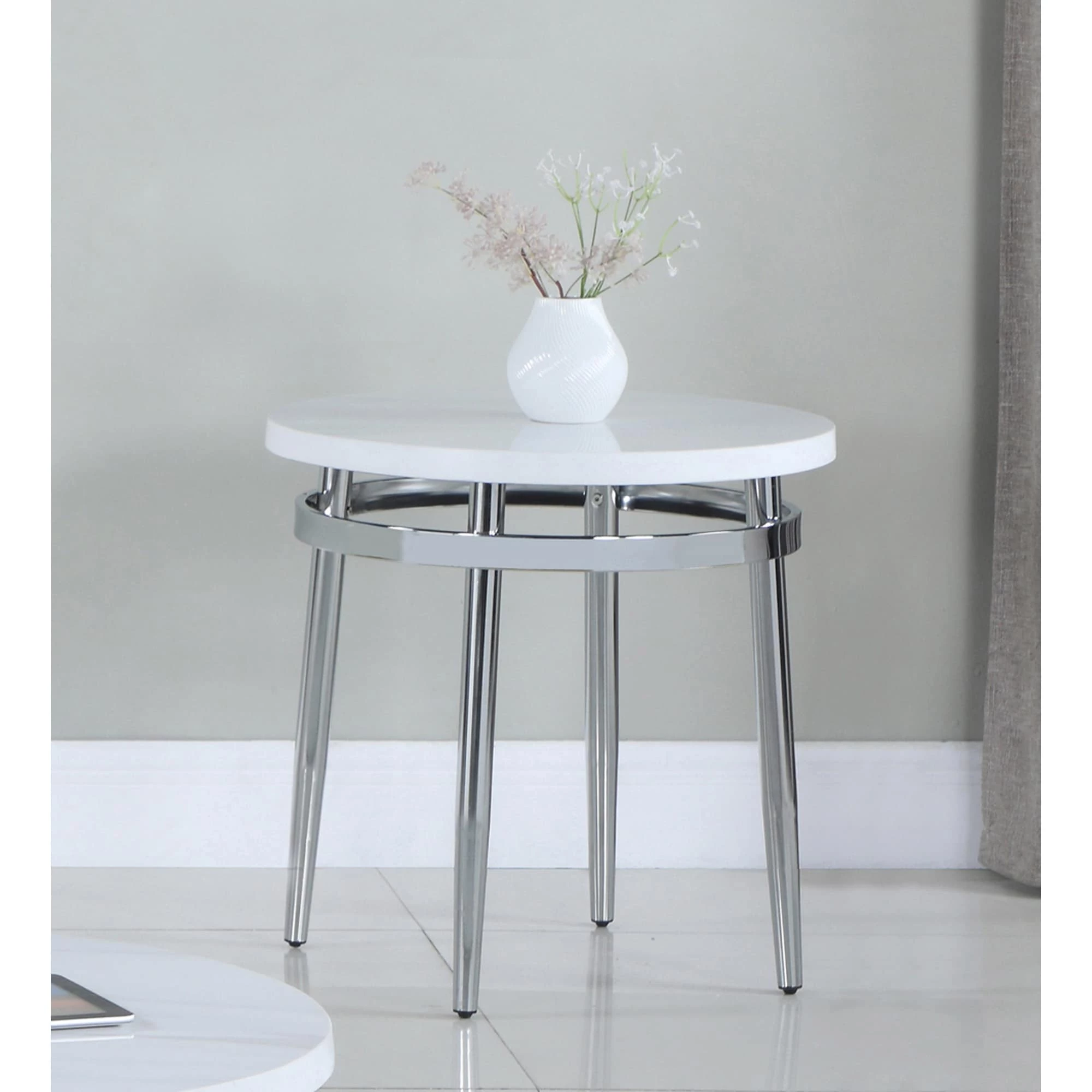 Elegant and striking, this round end table is ideal for a modern style home. Offering a touch of glam, this furniture piece is designed to offer a space next to a chair or sofa where you can keep a cocktail close at hand. Topped with a round faux Carrara marble top, complete with grey striations, it offers a cheerful bright look. The open and airy metal base is finished in an electroplated chrome that offers a lustrous, gleaming shine. Wrapped around the upper base, just below the tabletop, is a matching band, which is also supported by chrome tapered legs.