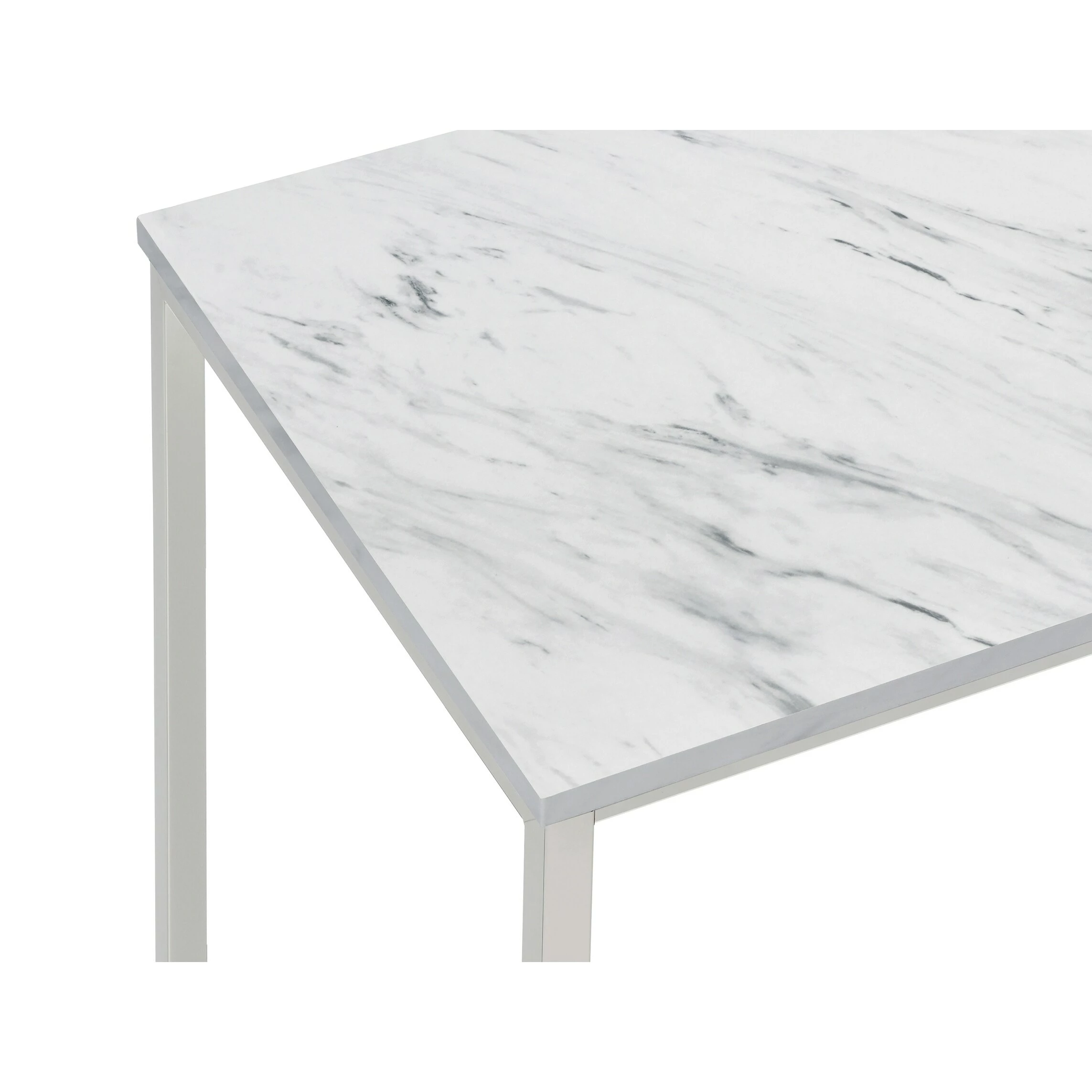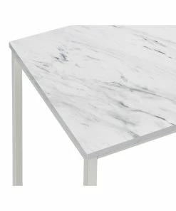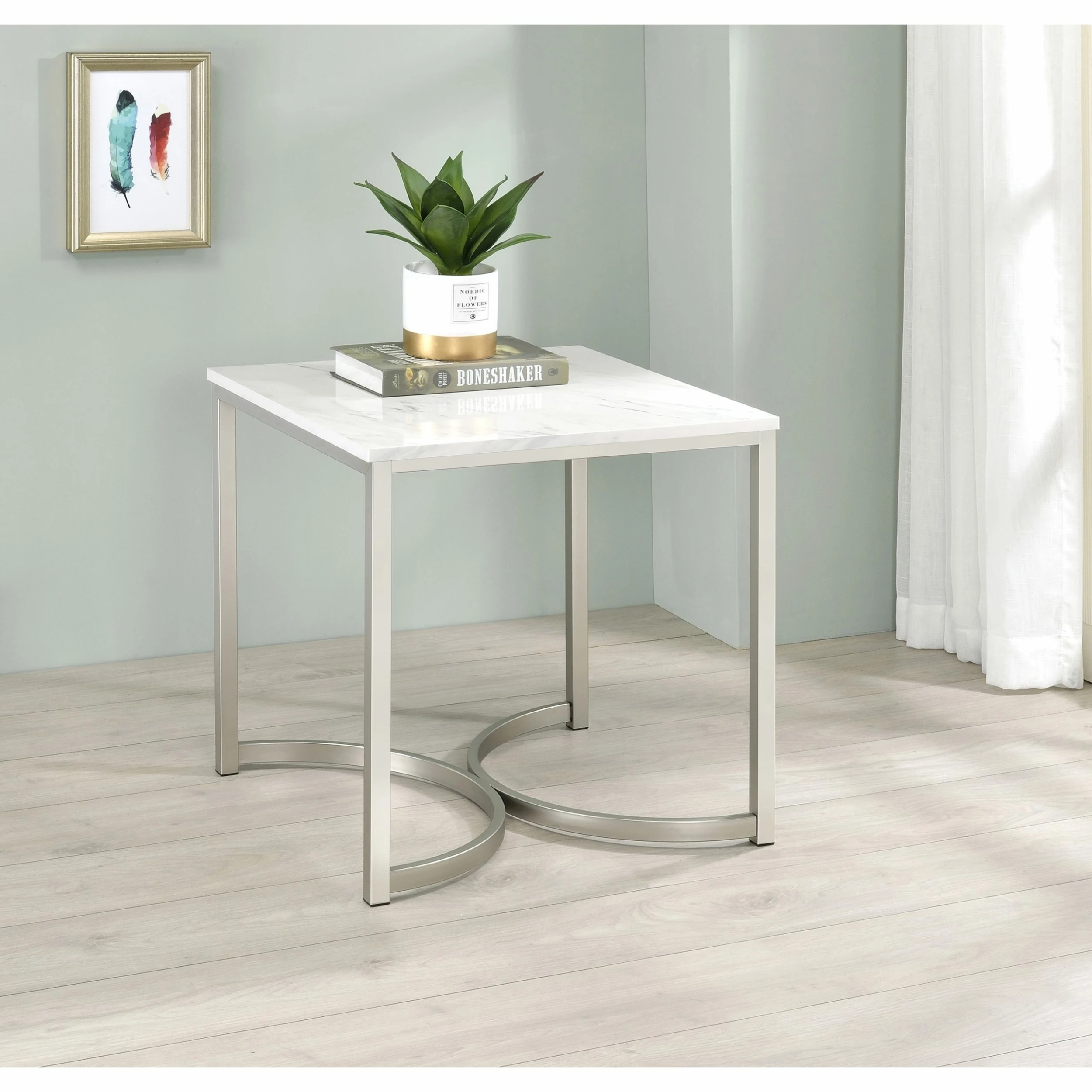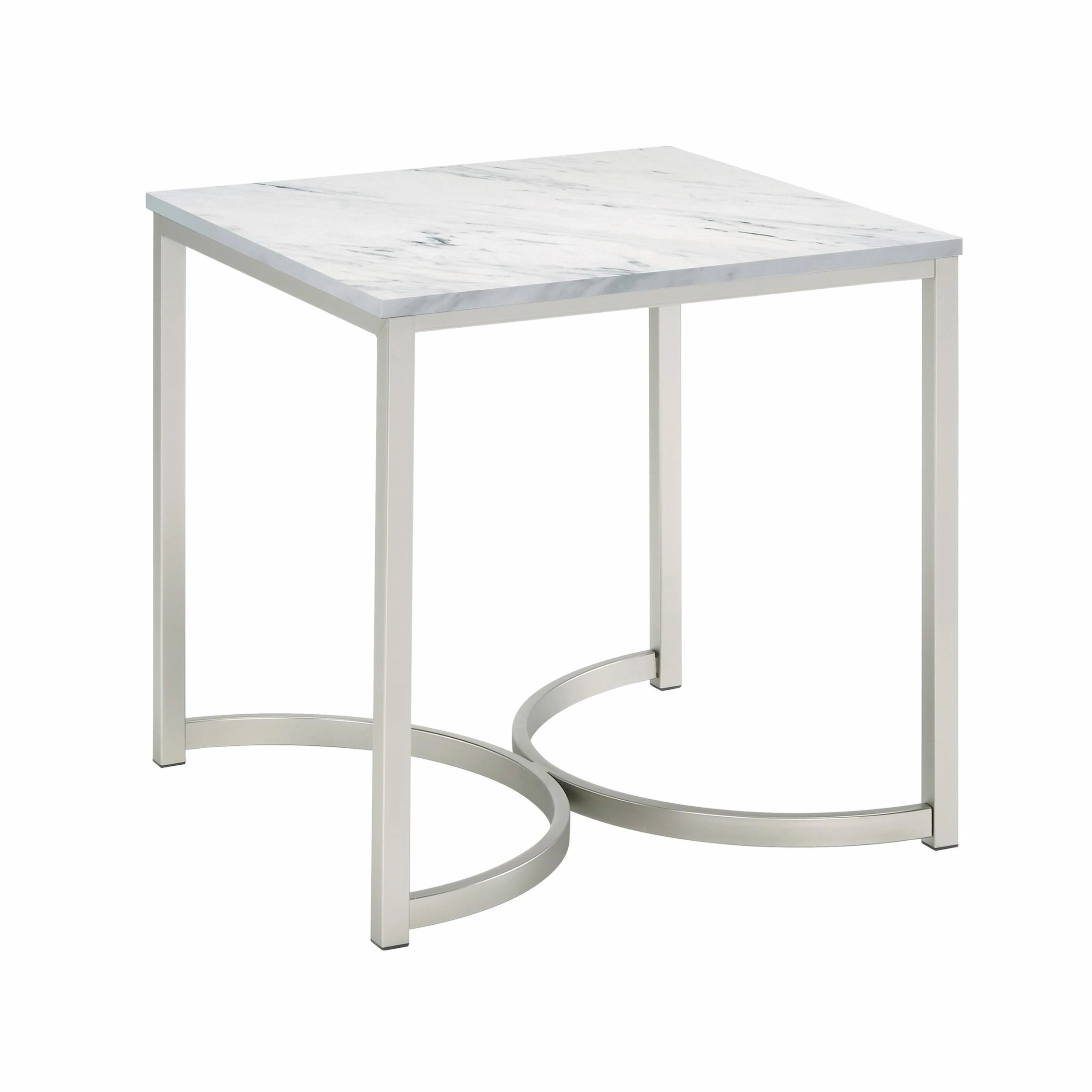 Eyes instantly gravitate to the curved base of this contemporary end table. Two U-shaped legs combine to make a stunning visual impact and support for the tabletop. The square tabletop is made from faux marble with a stunning white and grey color palette. When coupled with the silver base, this piece serves as an exceptional upgrade in your space. Place it near your favorite sofa and use it to display your favorite decor.